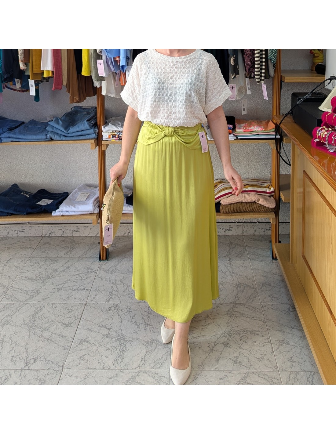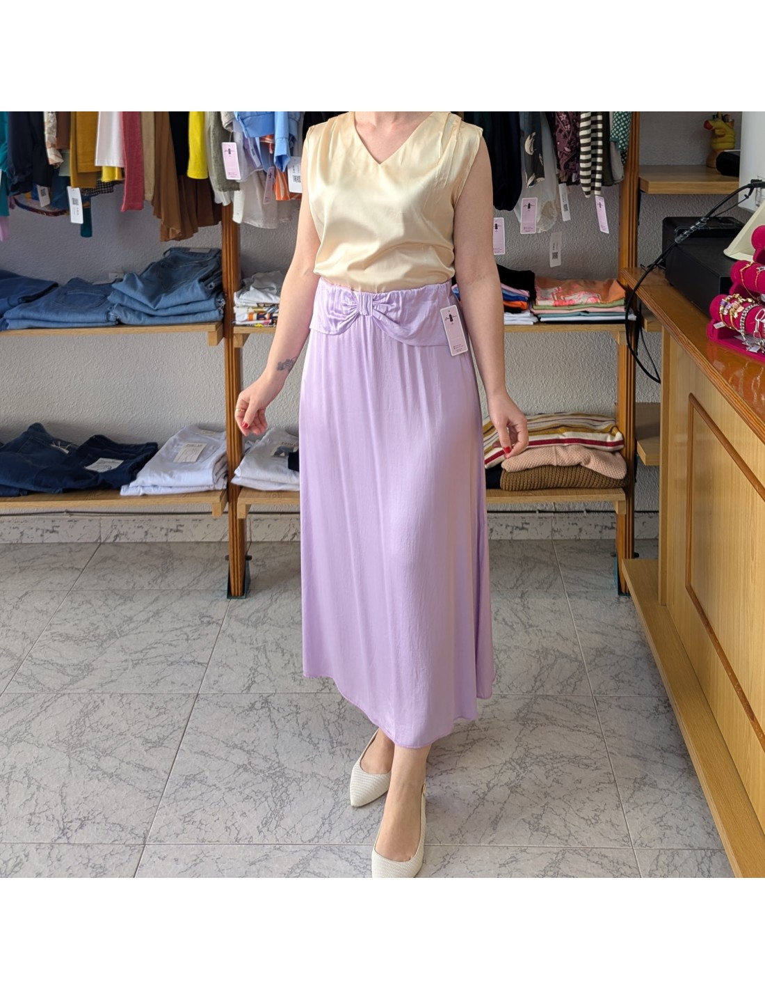 Elegante falda satinada, de largo midi, tiene el talle medio alto y la cintura elástica, de tejido ligero lo que le otorga una caída suave y movimiento. Detalle de lazo en la zona de la cintura.