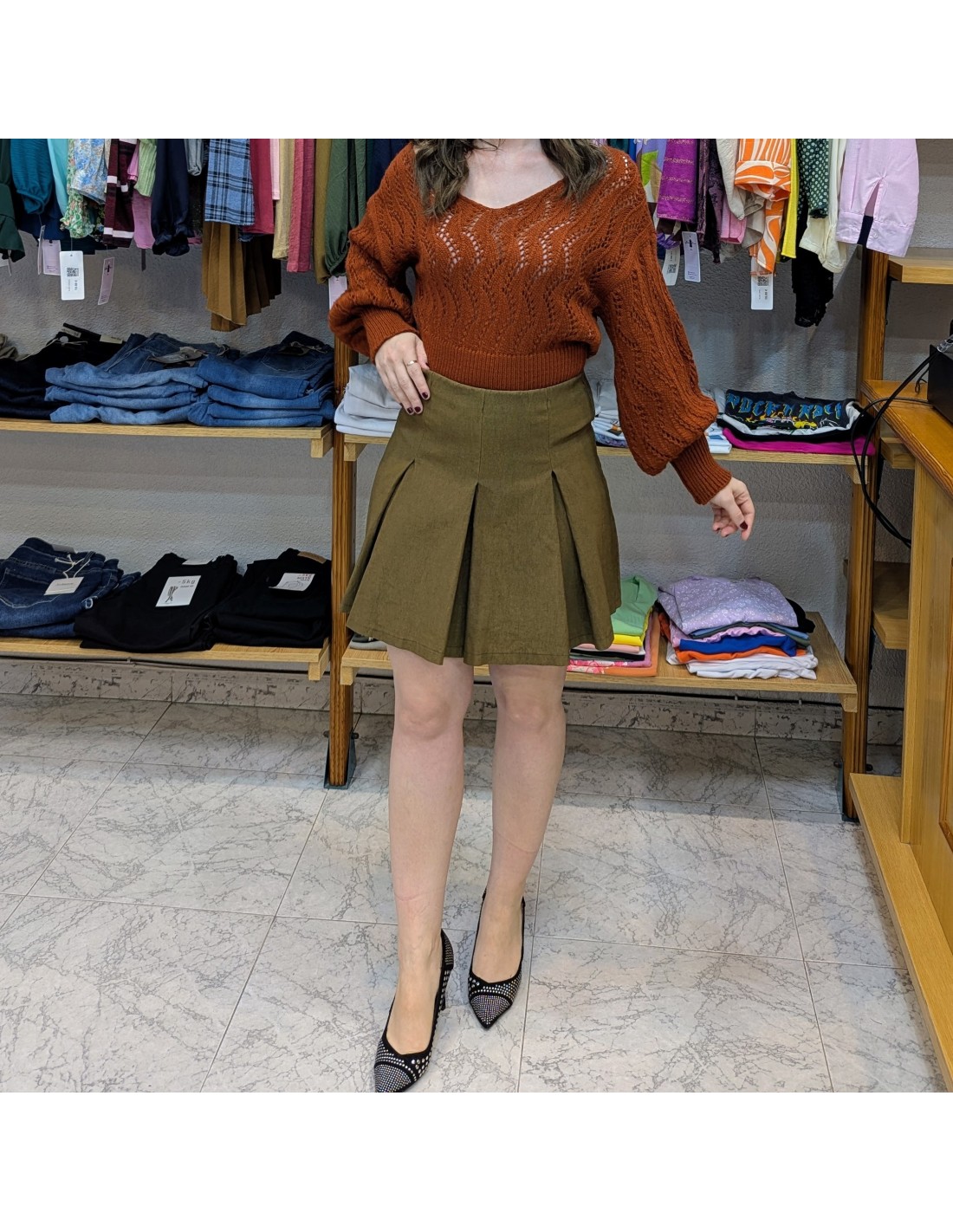Falda corta y elástica en color marrón, de corte en A, es ajustada en la cintura y se ensancha hacia el dobladillo. De palas anchas desde la cadera hacia abajo lo que le da volumen y movimiento.