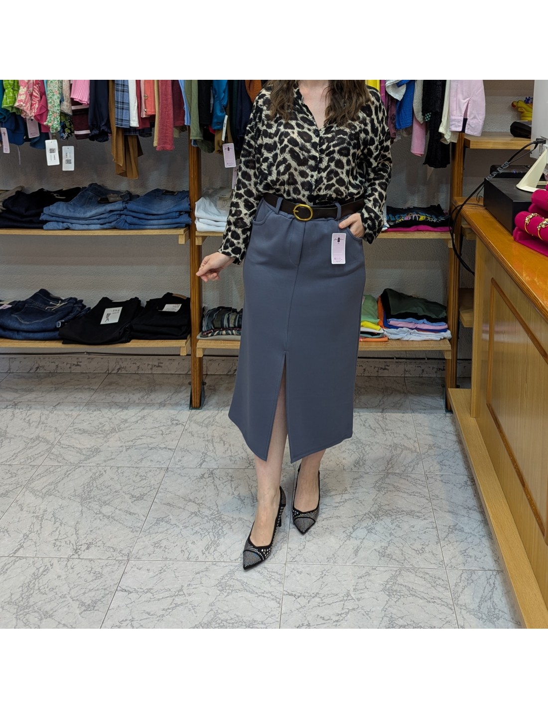 Falda de poliéster y elastán, de corte recto, talle alto y cintura elástica, bolsillo completamente funcionales, largo por debajo de la rodilla y tiene abertura en la parte delantera. La falda se complementa con un cinturón.