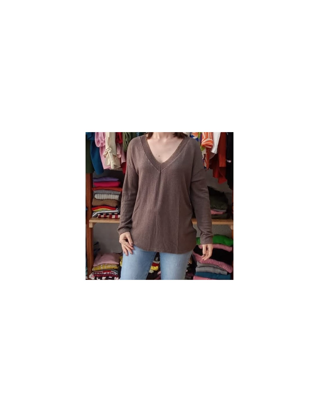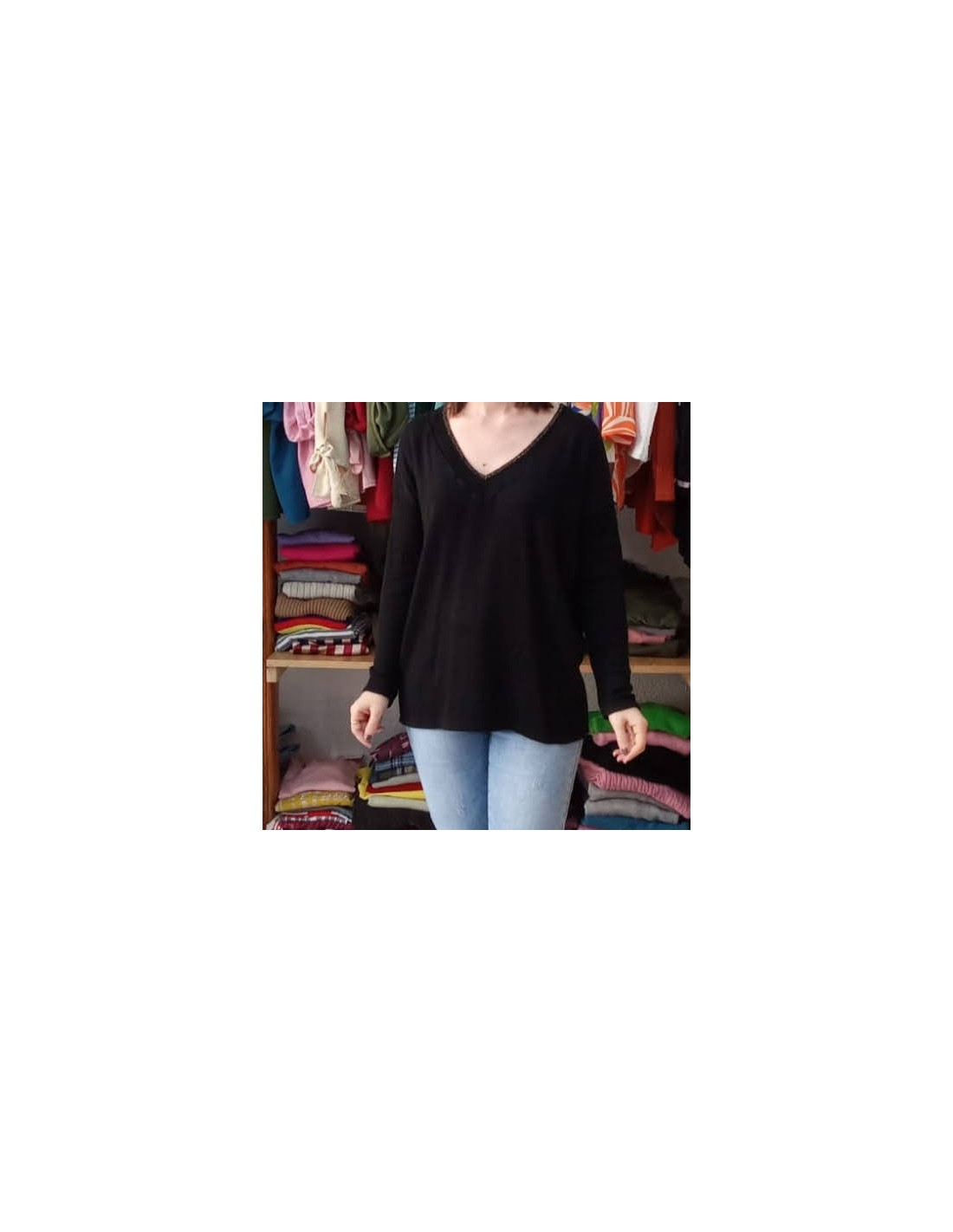 Suéter básico, de lana fina, muy suave y cálido, manga larga y escote en pico con detalle de dorado que le aporta un punto de luz.