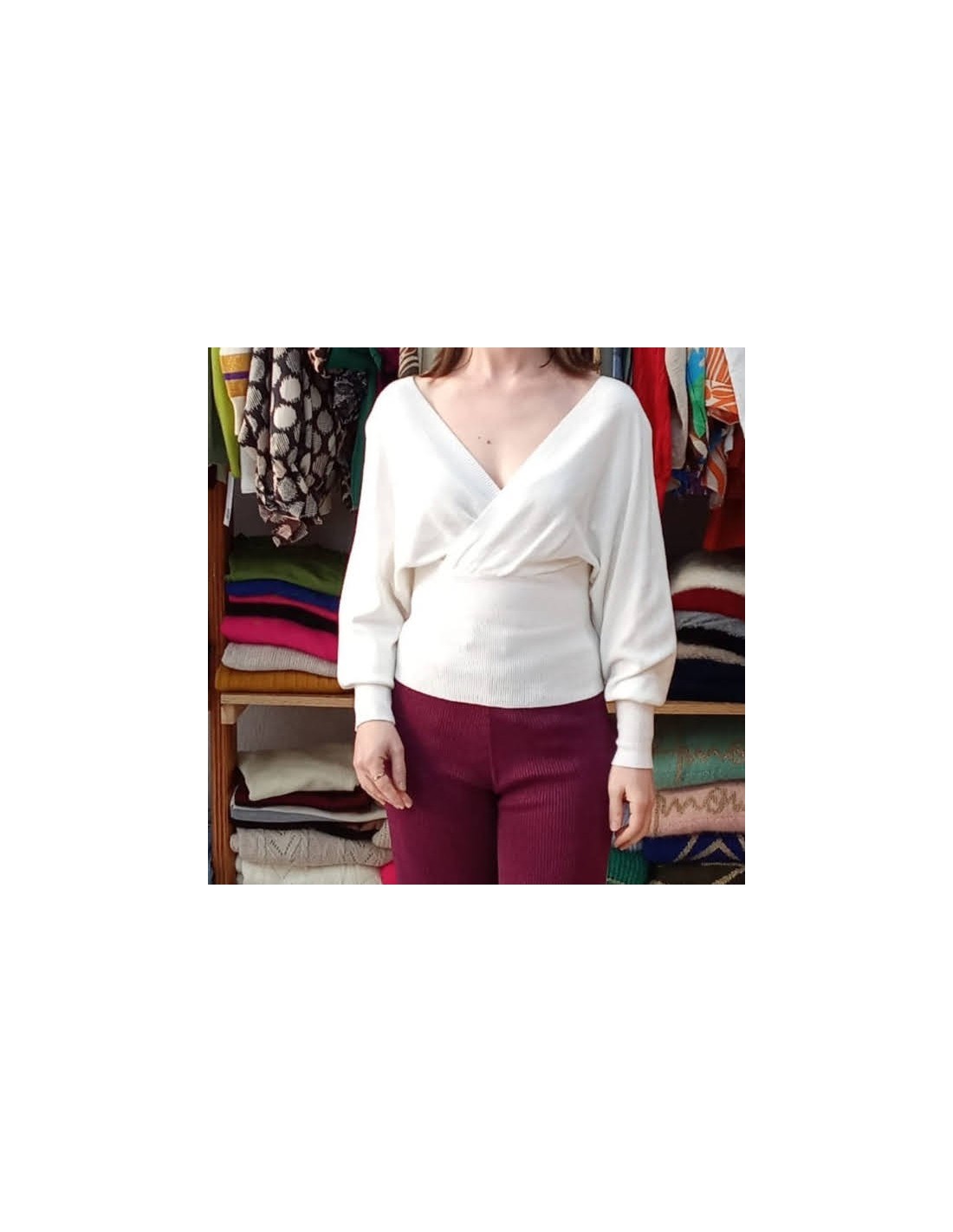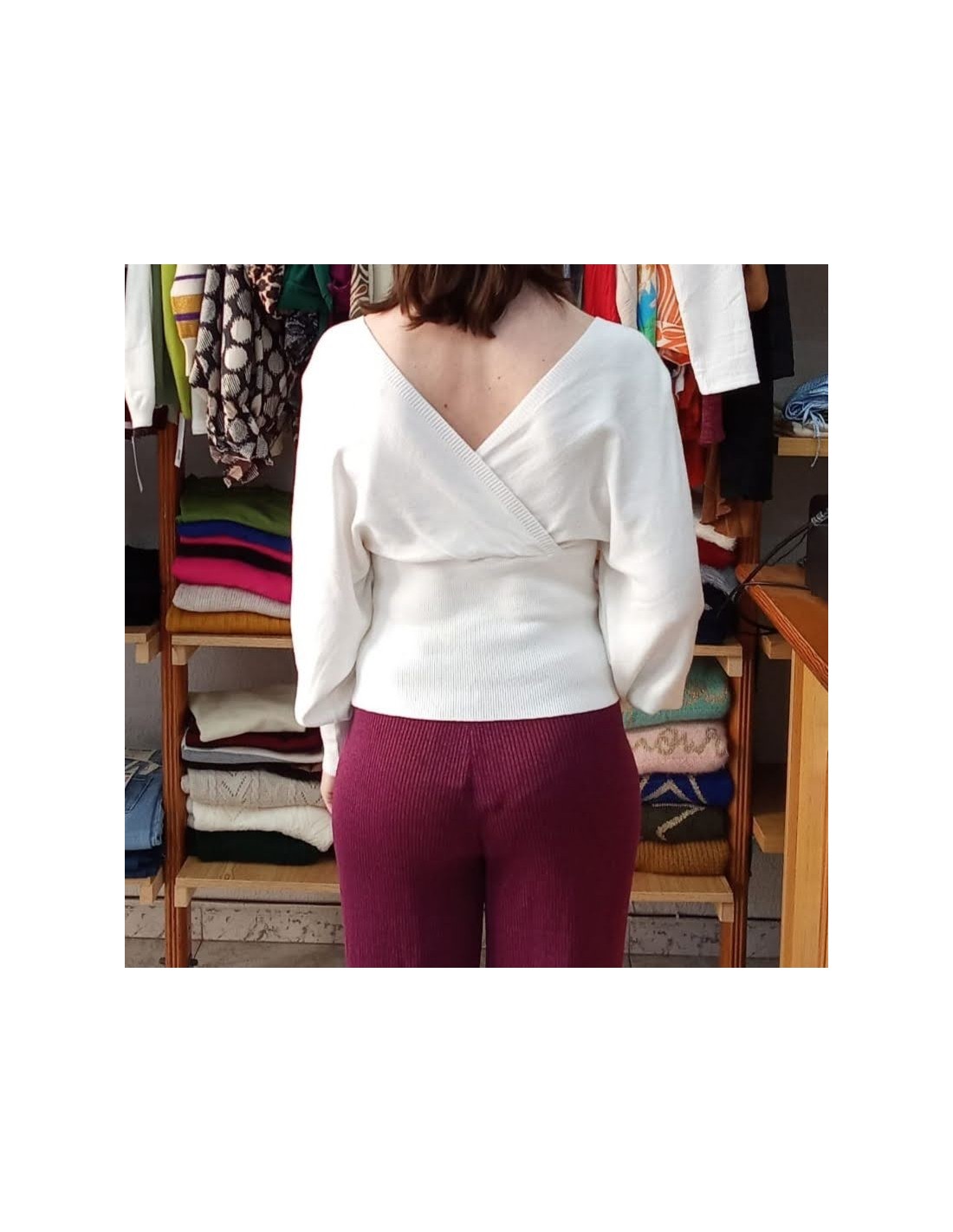 Suéter de lana fina con escote y espalda cruzada y hombro descubierto, de cintura ancha, puño estrecho y alargado y manga bombacha. Diseño favorecedor que resalta nuestra silueta.