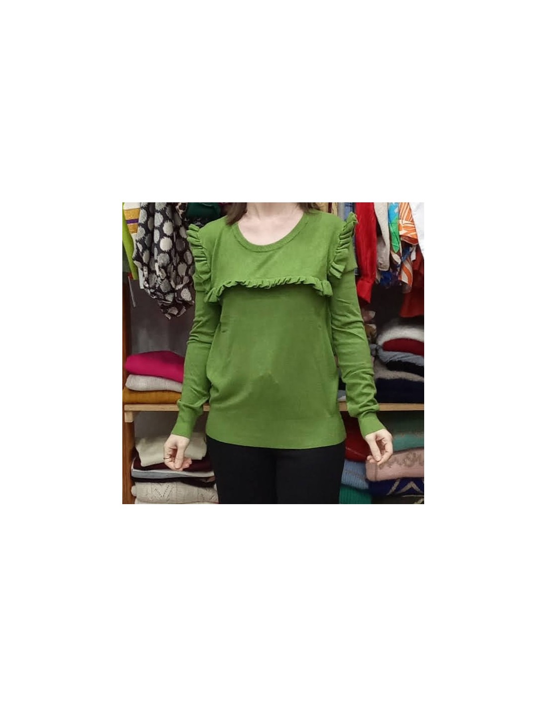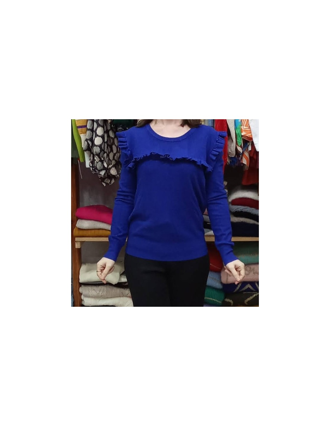 Elegante jersey, confeccionado en tejido de alta calidad, su diseño atemporal presenta un corte clásico que se adapta a cualquier silueta. Este jersey de lana es un imprescindible en tu armario. Detalle de volante en pecho y hombro, cuello redondo, manga al hombre y largo hasta la cadera.