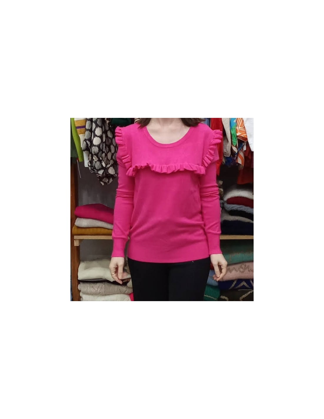 Elegante jersey, confeccionado en tejido de alta calidad, su diseño atemporal presenta un corte clásico que se adapta a cualquier silueta. Este jersey de lana es un imprescindible en tu armario. Detalle de volante en pecho y hombro, cuello redondo, manga al hombre y largo hasta la cadera.