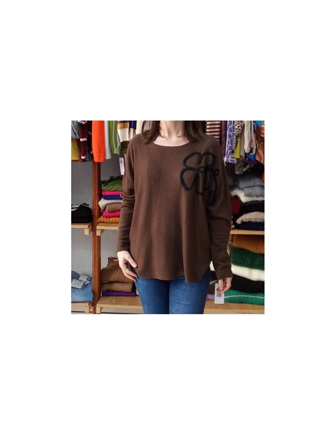 Suéter de lana fina, de talla amplia, corte holgado, cuello redondo y manga caída, corte camisero en la parte inferior y largo hasta la cadera.