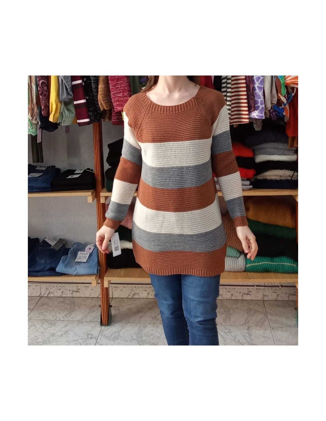 Jersey de lana, largo y entallado, con cuello redondo y manga al hombro, suave y cálido, un jersey muy favorecedor. Con dibujo de rayas anchas y tricolor.