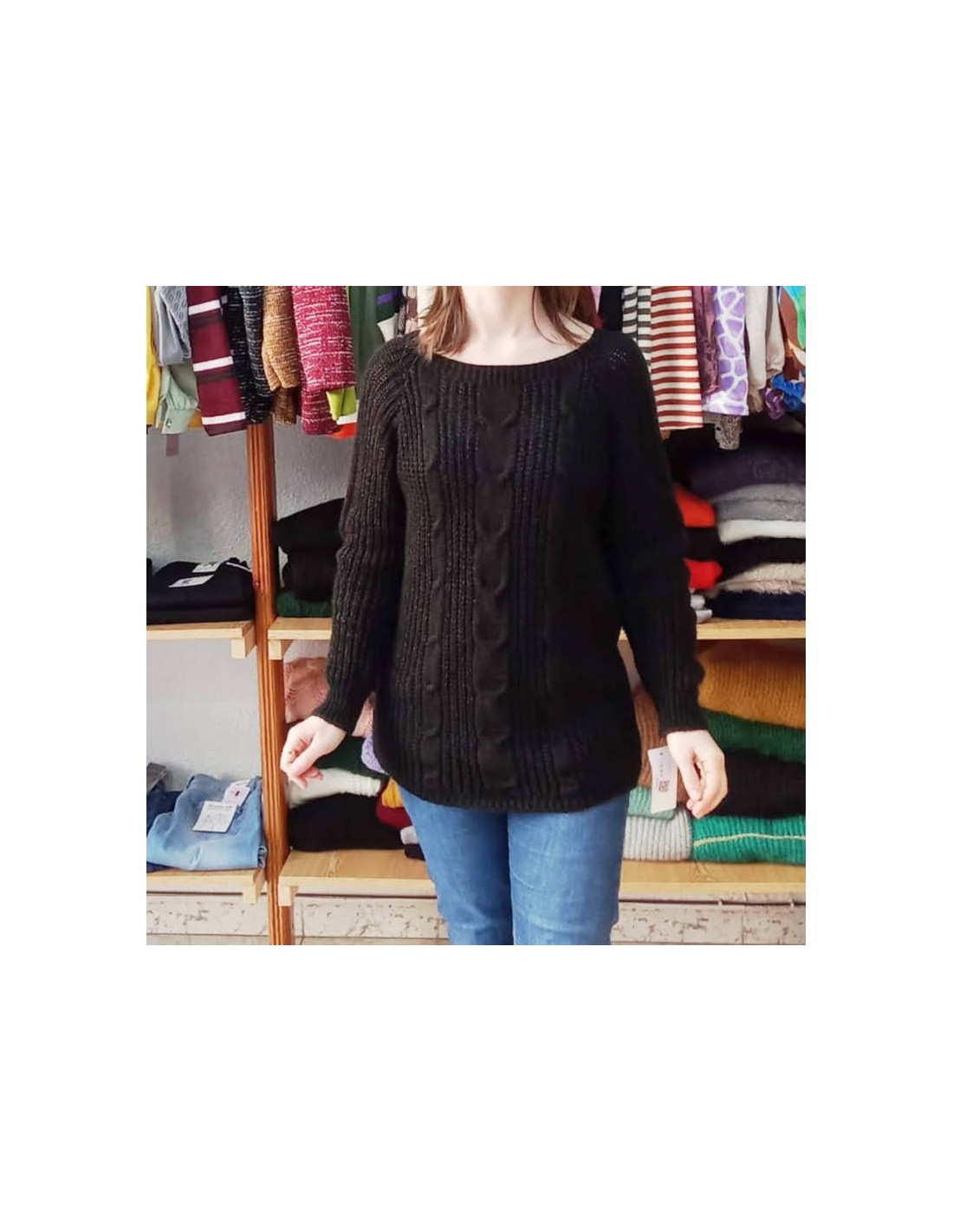 Jersey de lana, jersey largo, cuello redondo y manga al hombro, con textura con dibujo de trenza ancha y en punto de arroz. Un básico en color negro muy combinable y perfecto para el invierno.