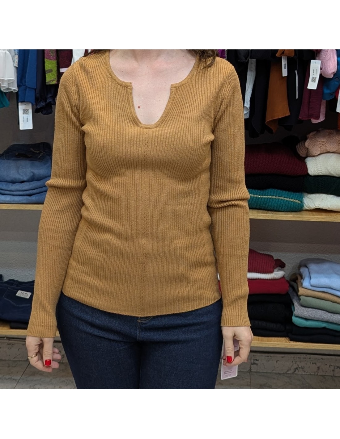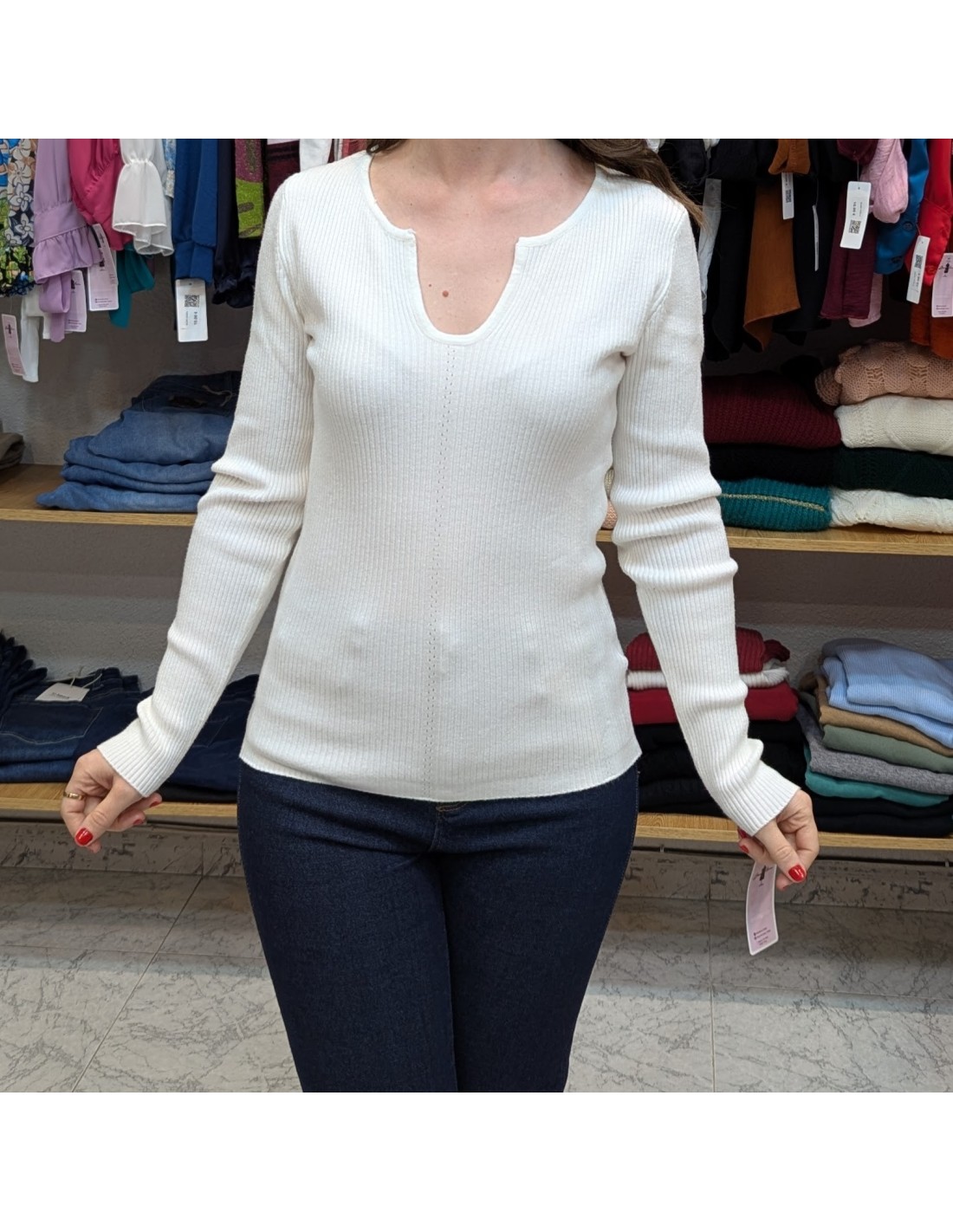 Jersey de lana con dibujo de canalé, escote en V, ajustado al cuerpo, detalle de calado muy sutil en la parte frontal.
