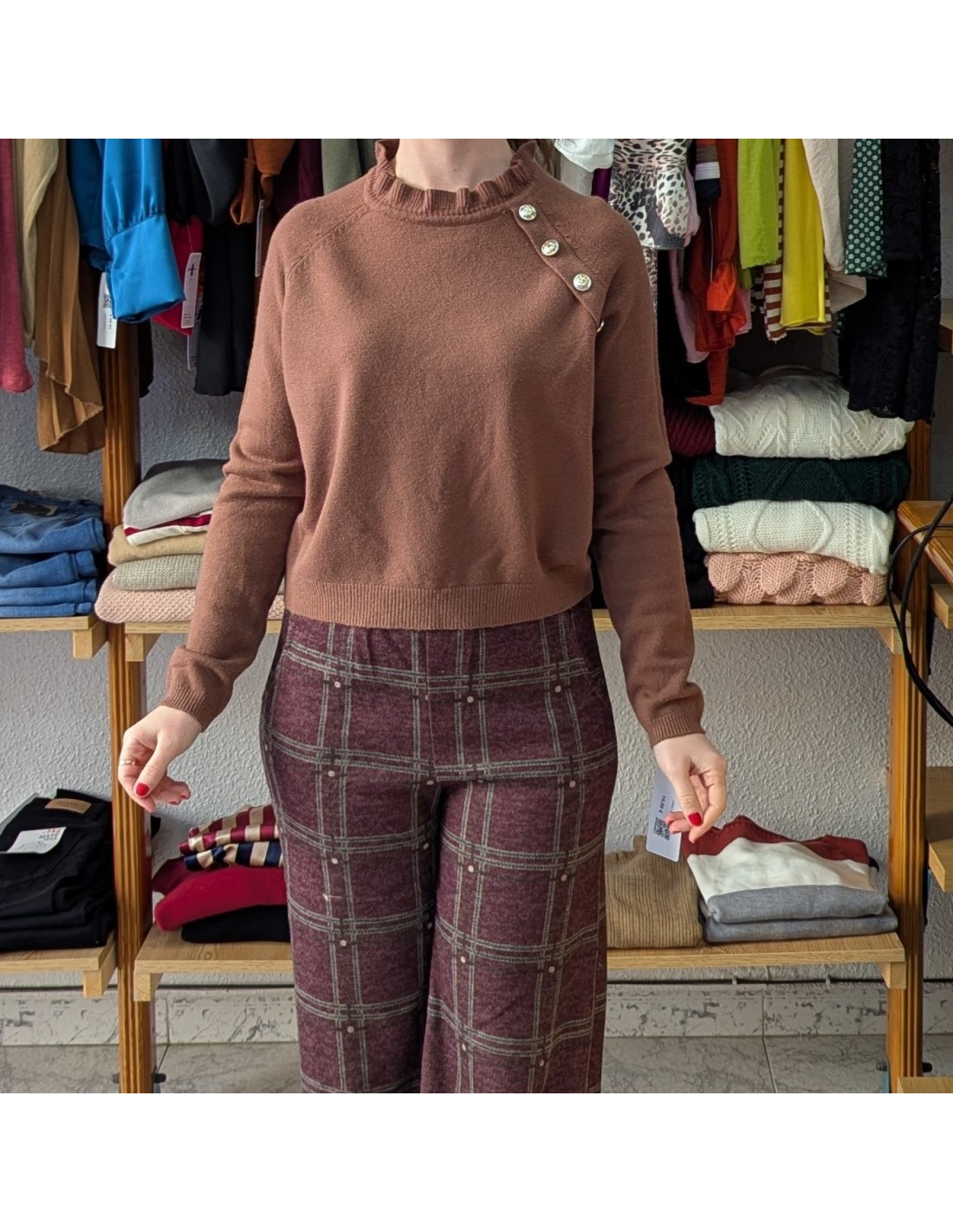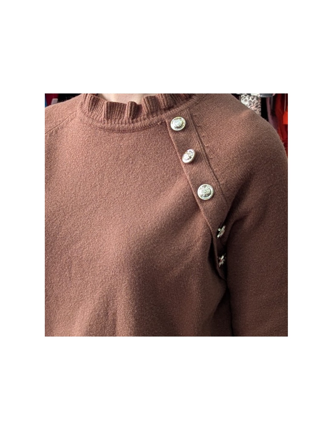 Jersey de manga larga con cuello tipo perkins fruncido, con botones decorativos en el hombro, largo hasta la cintura.