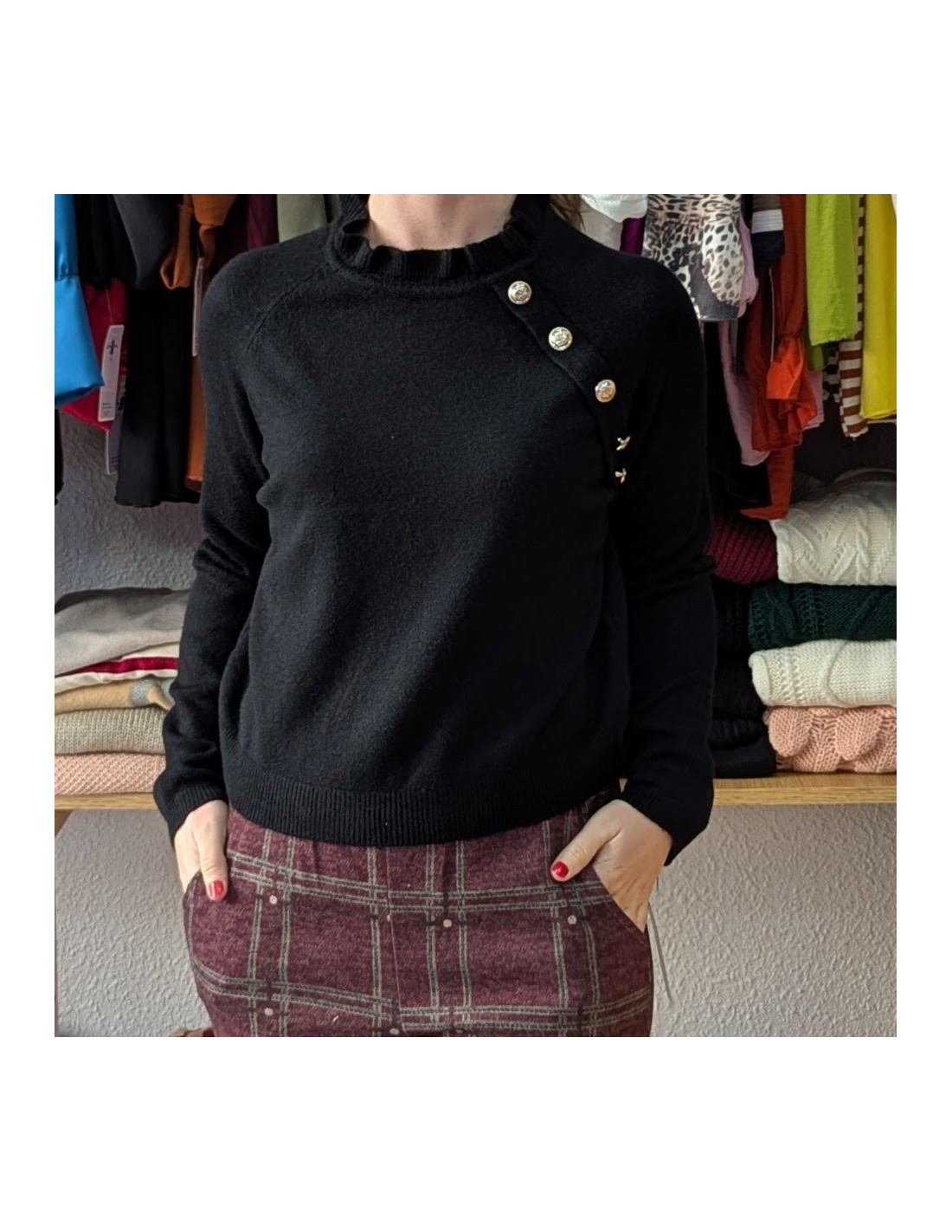 Jersey de manga larga con cuello tipo perkins fruncido, con botones decorativos en el hombro, largo hasta la cintura.
