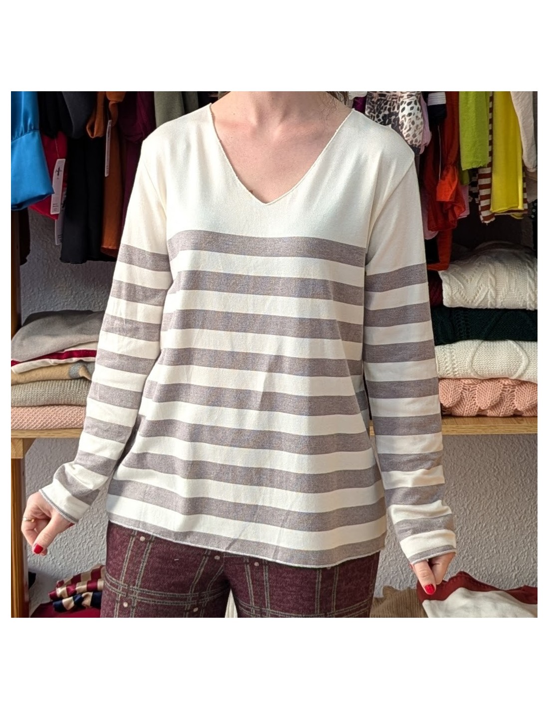 Suéter de punto, manga larga y escote en V, en color beige con diseño de rayas, de tacto suave y muy cómodo. De estilo casual, perfecto para tus looks diarios.
