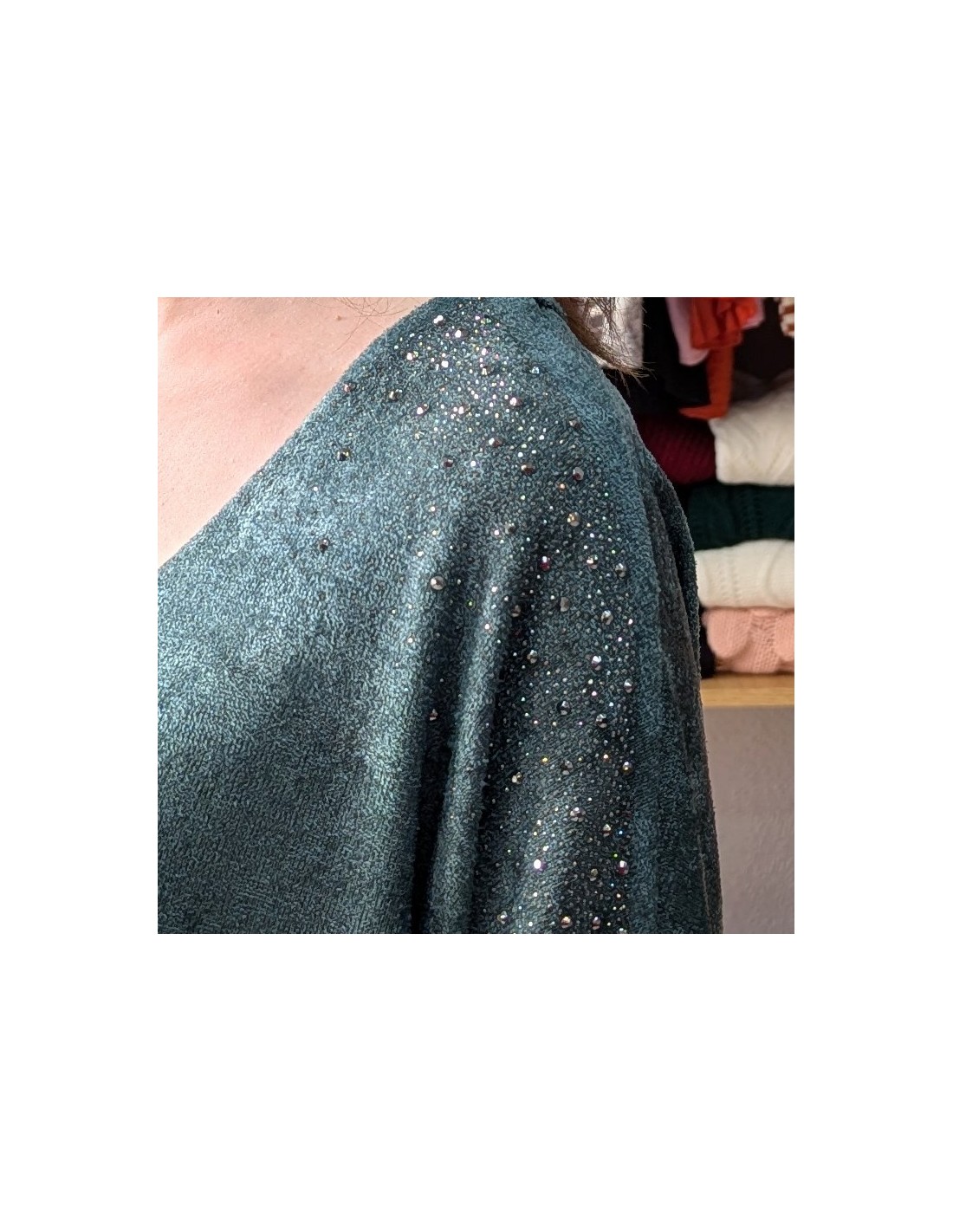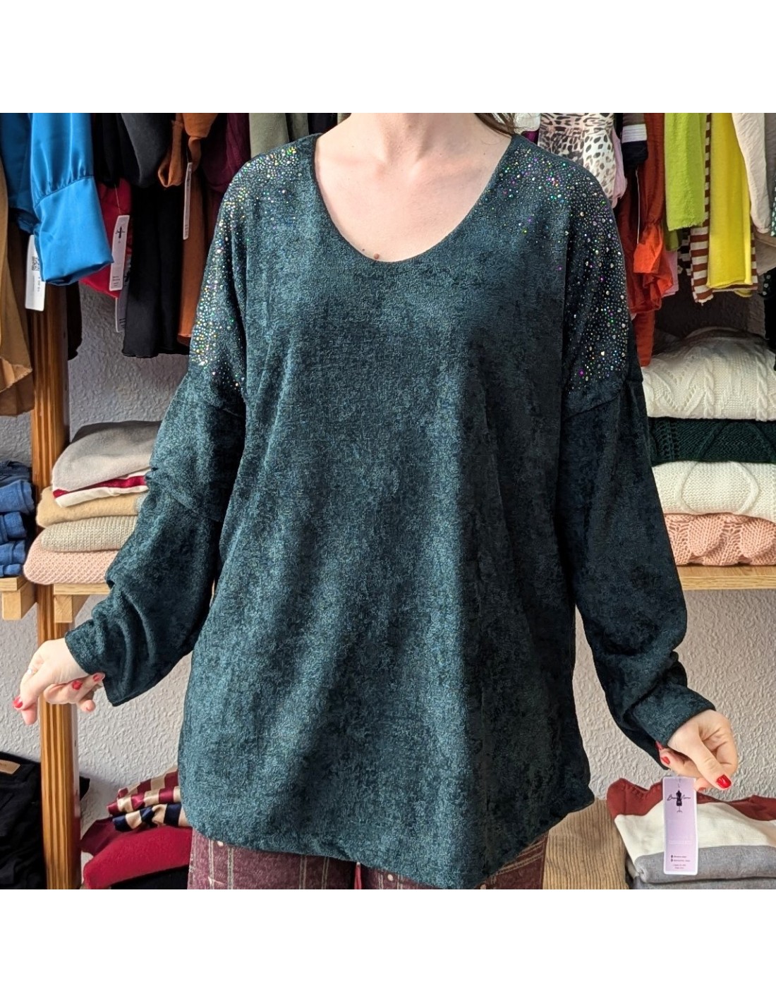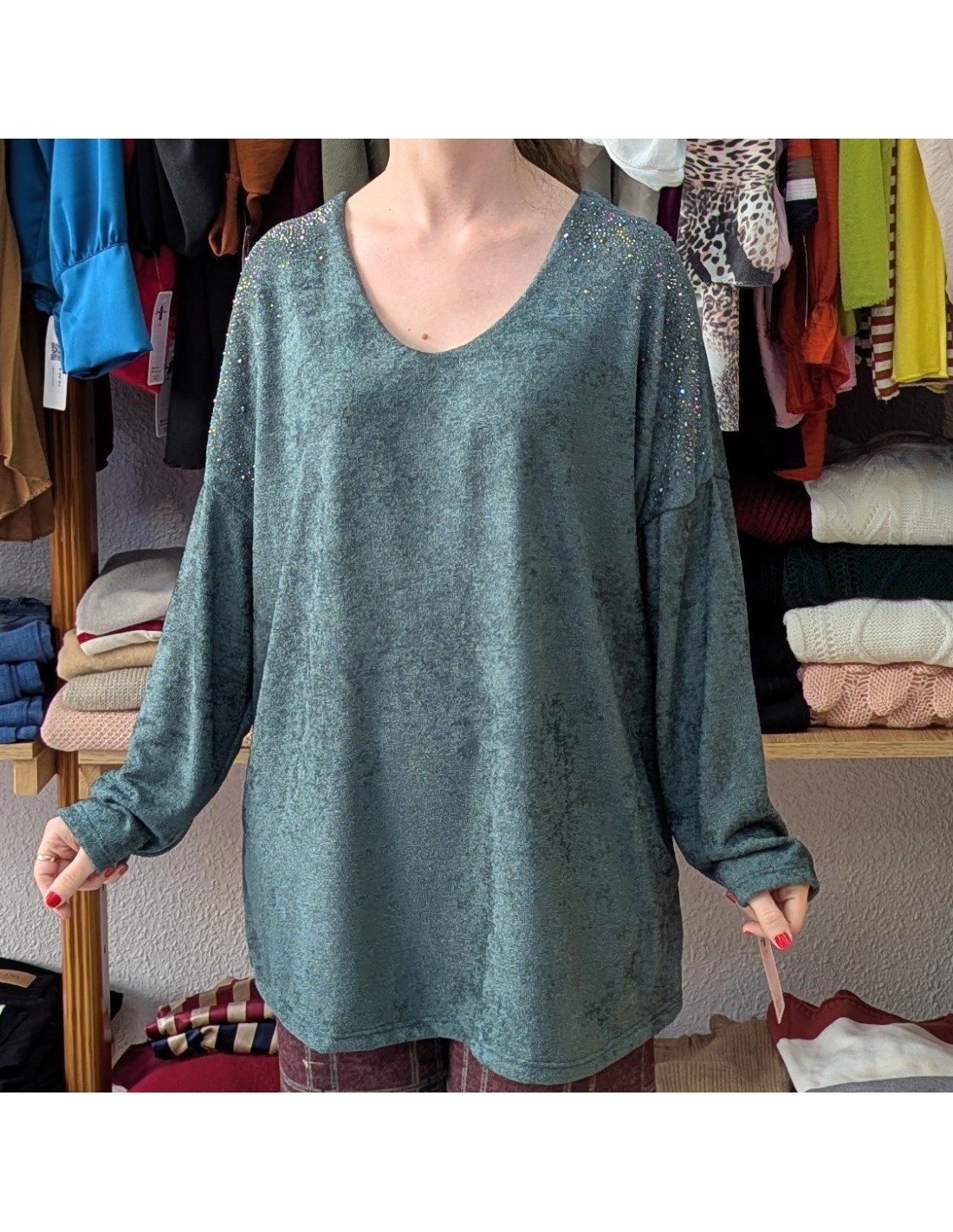 Jersey tipo suéter, de talla grande, de manga larga, con escote en V, detalle de pedrería en los hombros. Tejido de chenilla, suave y cálido.
