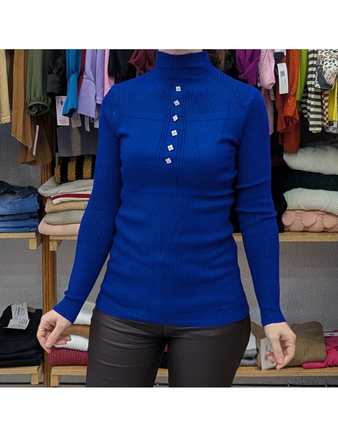 Jersey /Suéter de punto acanalado con cuello cisne y manga larga, es elástico y queda entallado al cuerpo, tiene detalle de botones decorativos con forma de flor en la parte del pecho.