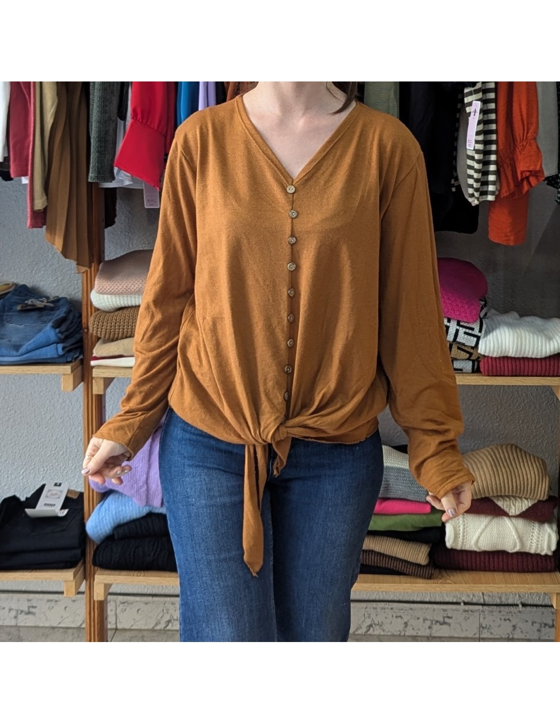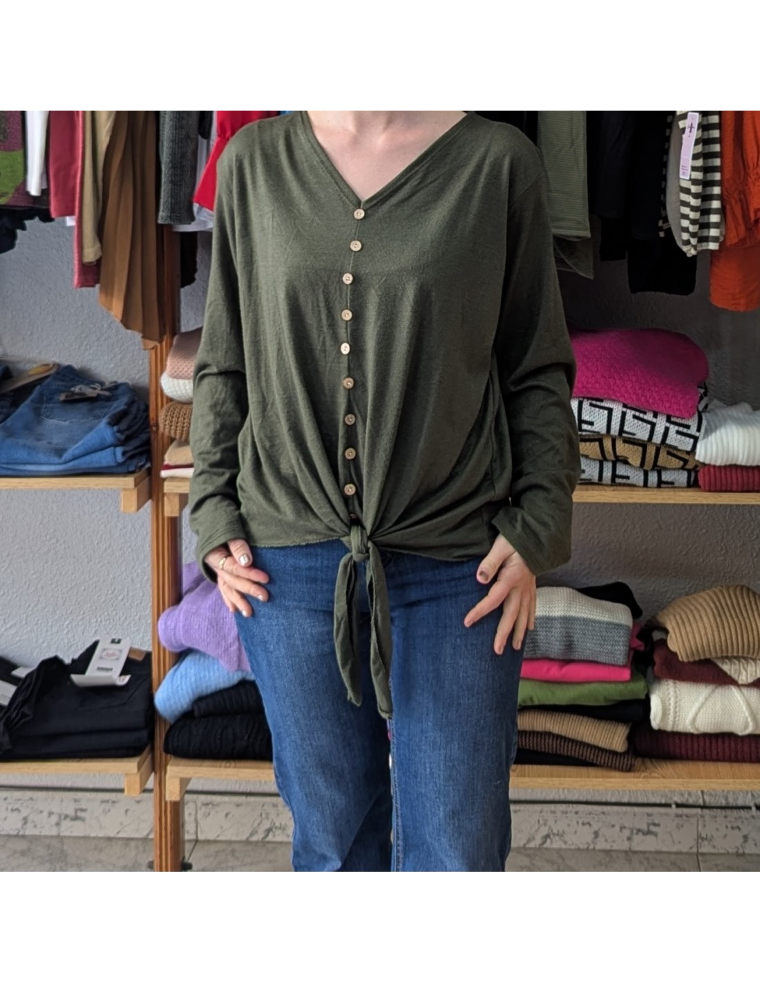 Suéter anudado de manga larga con escote en pico y detalle de botones en la zona del pecho.