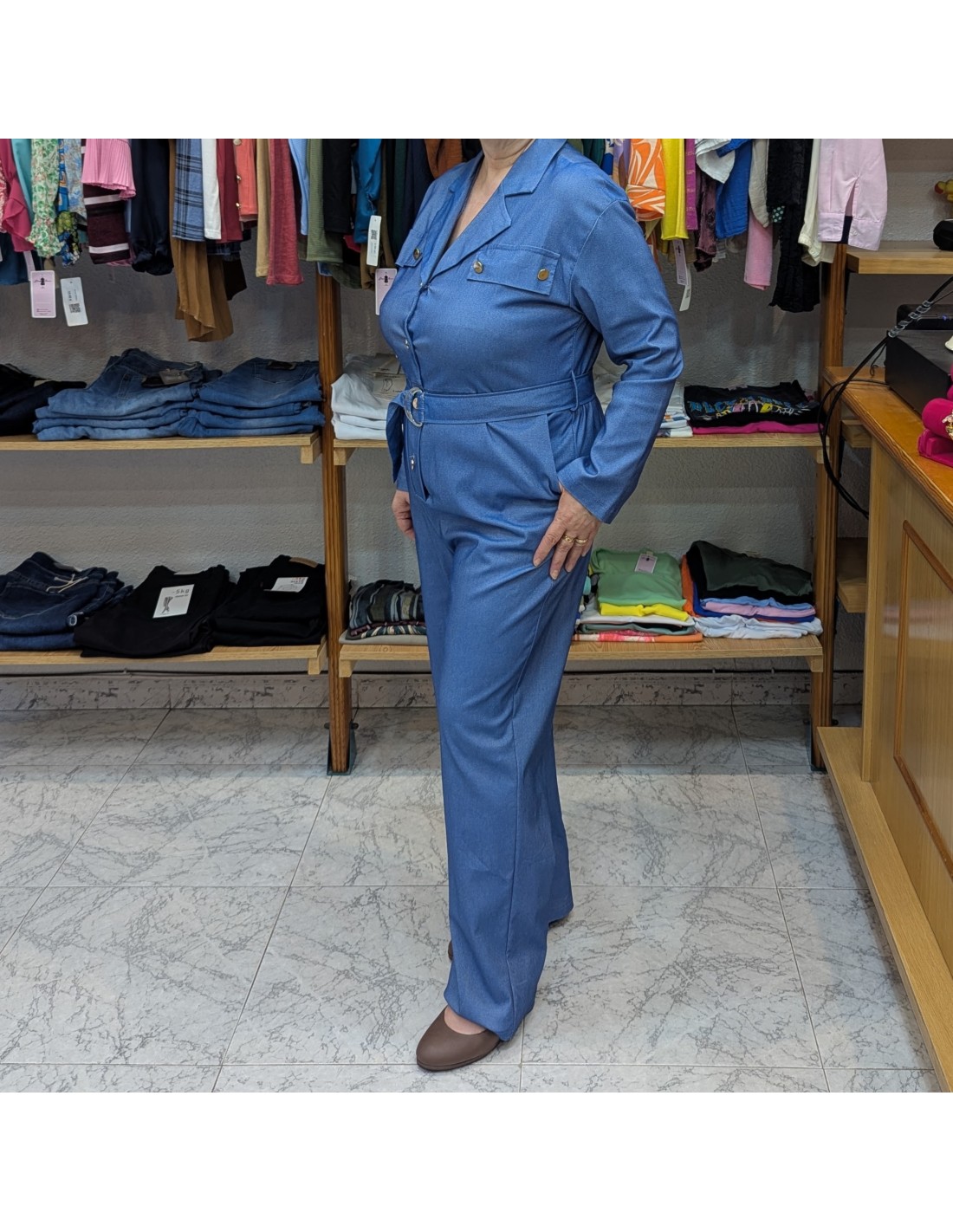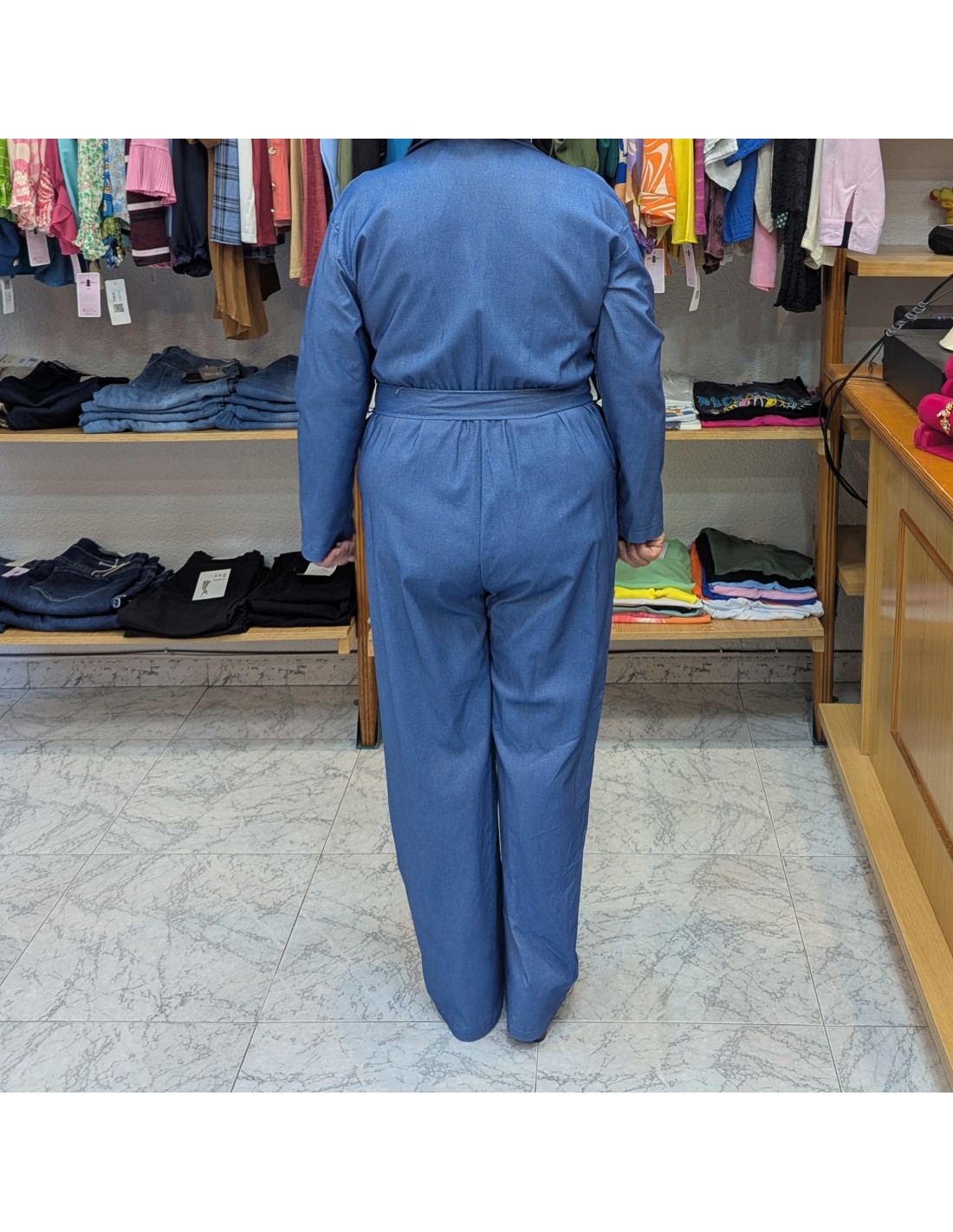 Mono de manga larga con cuello de solapa y cierre frontal de botones, tiene falsos bolsillos en la zona del pecho y bolsillos completamente funcionales en la parte del pantalón, incluye cinturón del mismo tejido con hebilla para ajustar la prenda a la cintura. Mono de tejido elástico, es cómodo y estiliza la silueta.