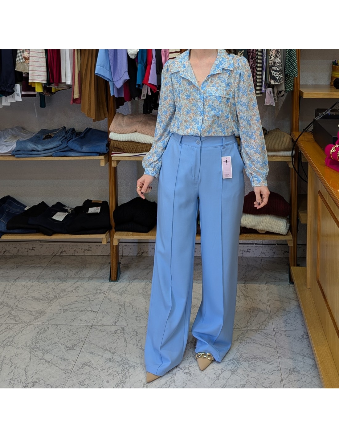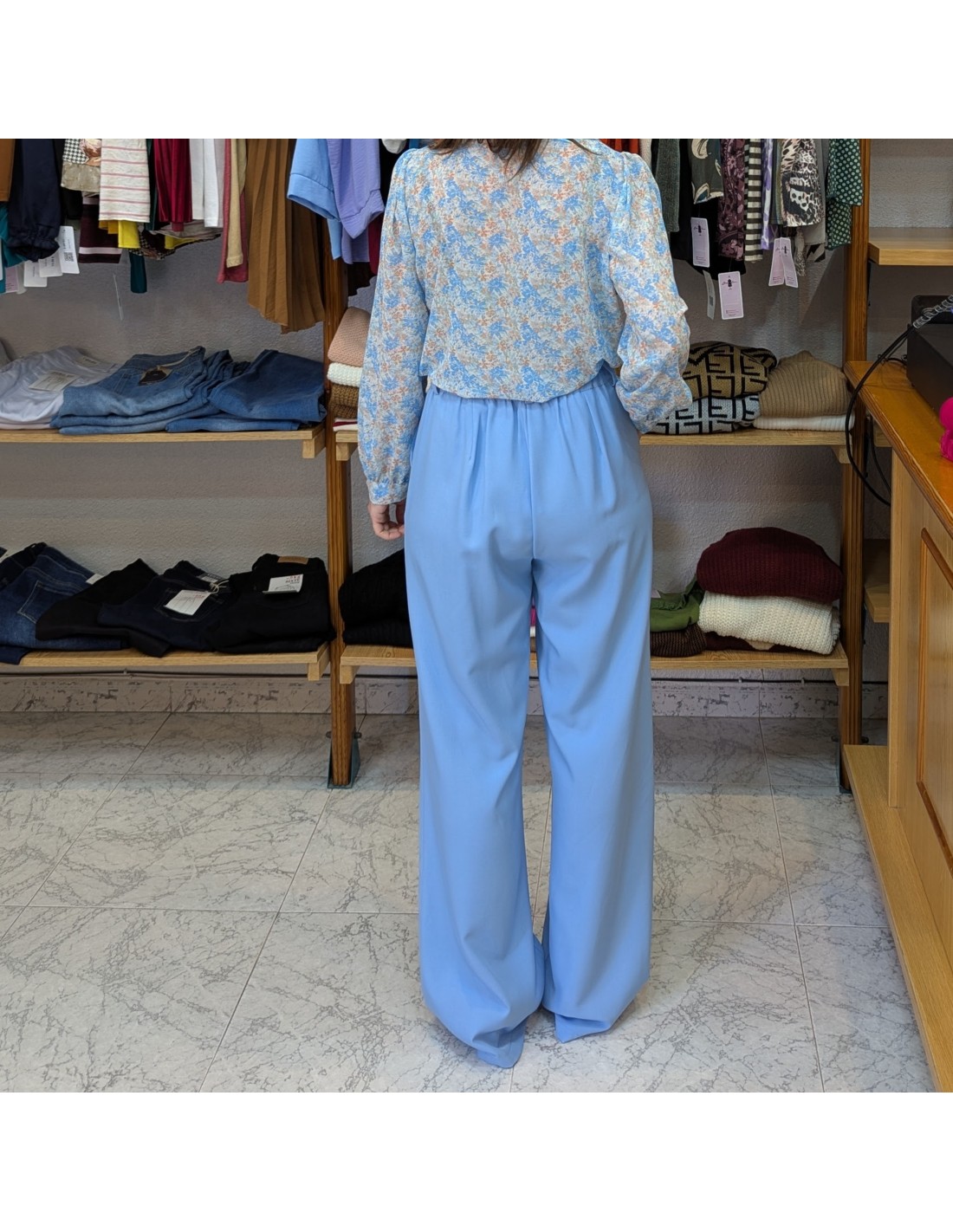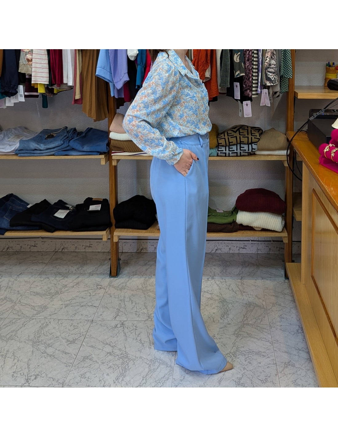 Elegante pantalón de vestir de estilo palazzo, el corte cae de forma recta y amplia desde la cadera hasta el pie proporcionándole movimiento y caída, talle algo y cintura elástica, cierre de botón y cremallera. Presenta una línea vertical marcada en el centro de cada pierna, un detalle clásico de la sastrería que aporta estructura y formalidad a la prenda.