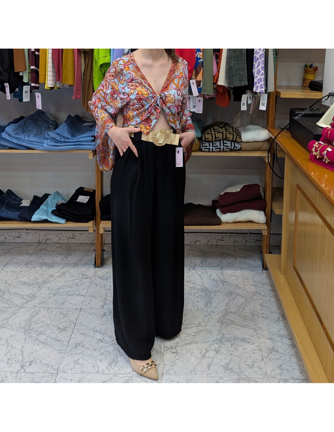 Un elegante pantalón de estilo palazzo de pierna ancha y tiro alto, combinados con un cinturón de rafia que acentúa la cintura. Perfecto para primavera y verano por su tejido suave y fresco.
