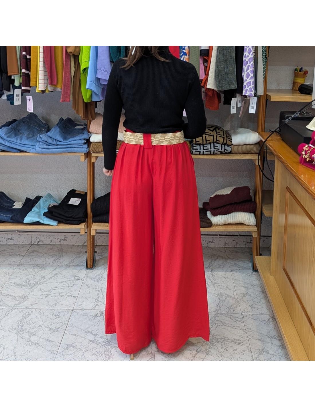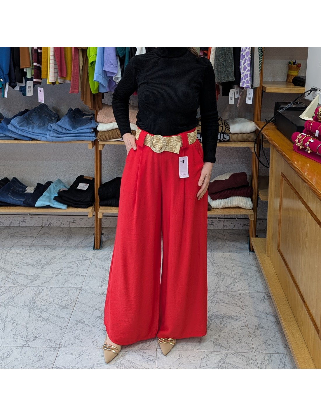 Un elegante pantalón de estilo palazzo de pierna ancha y tiro alto, combinados con un cinturón de rafia que acentúa la cintura. Perfecto para primavera y verano por su tejido suave y fresco.
