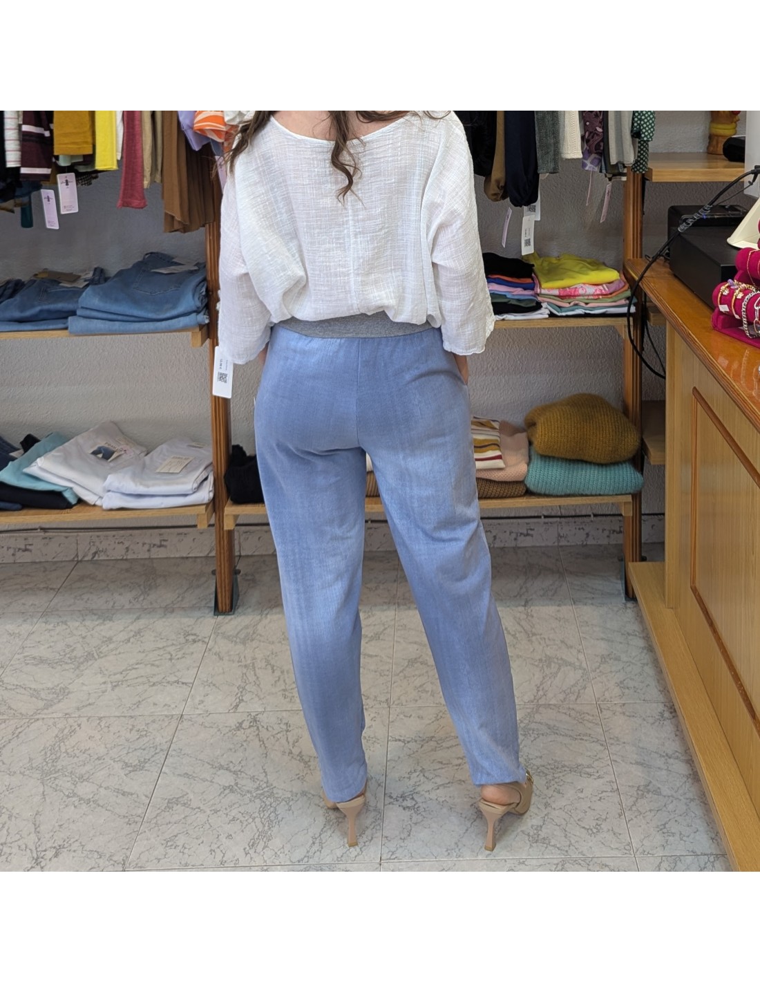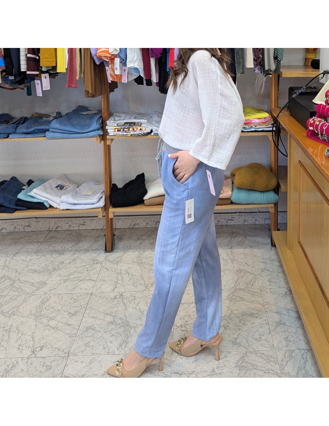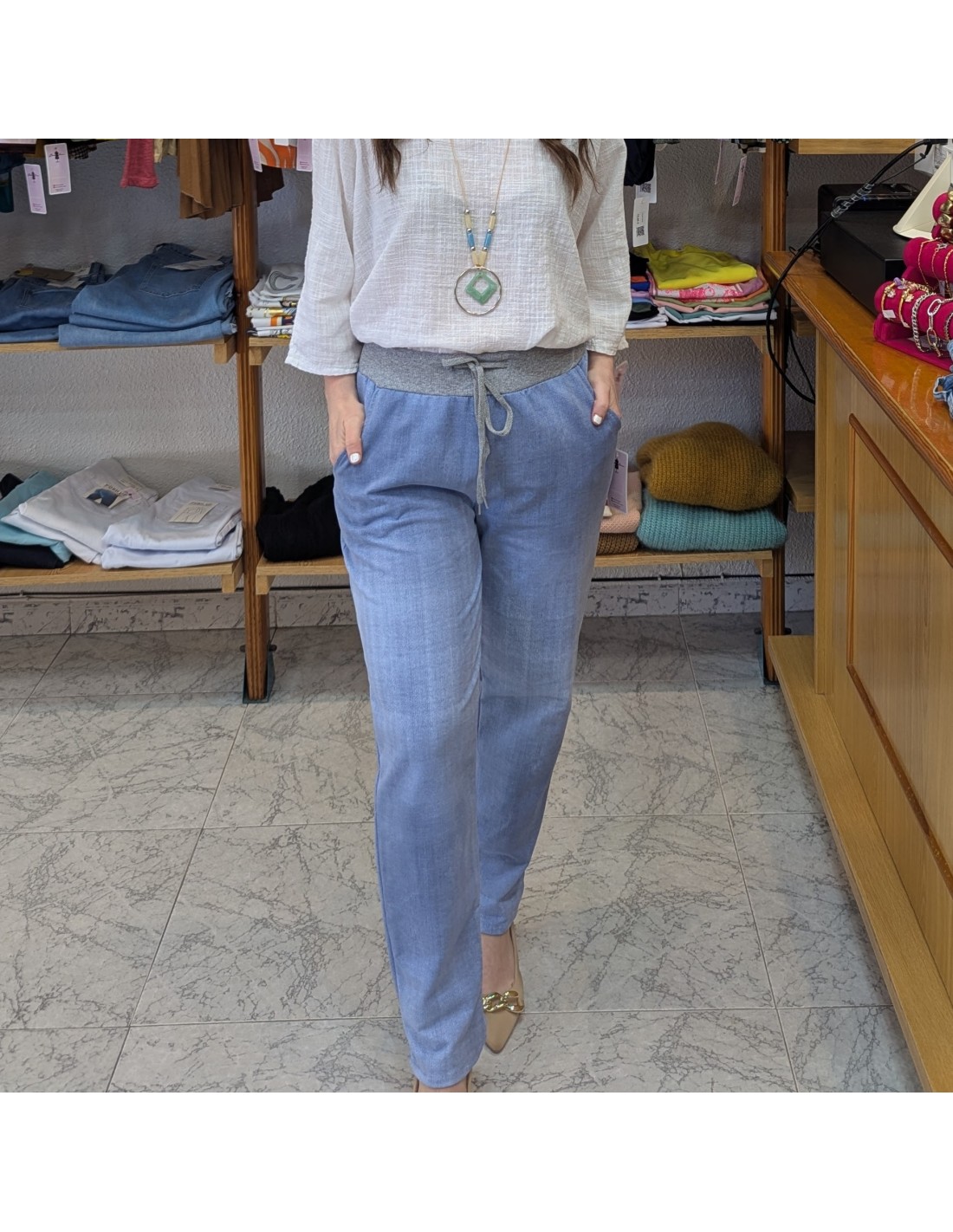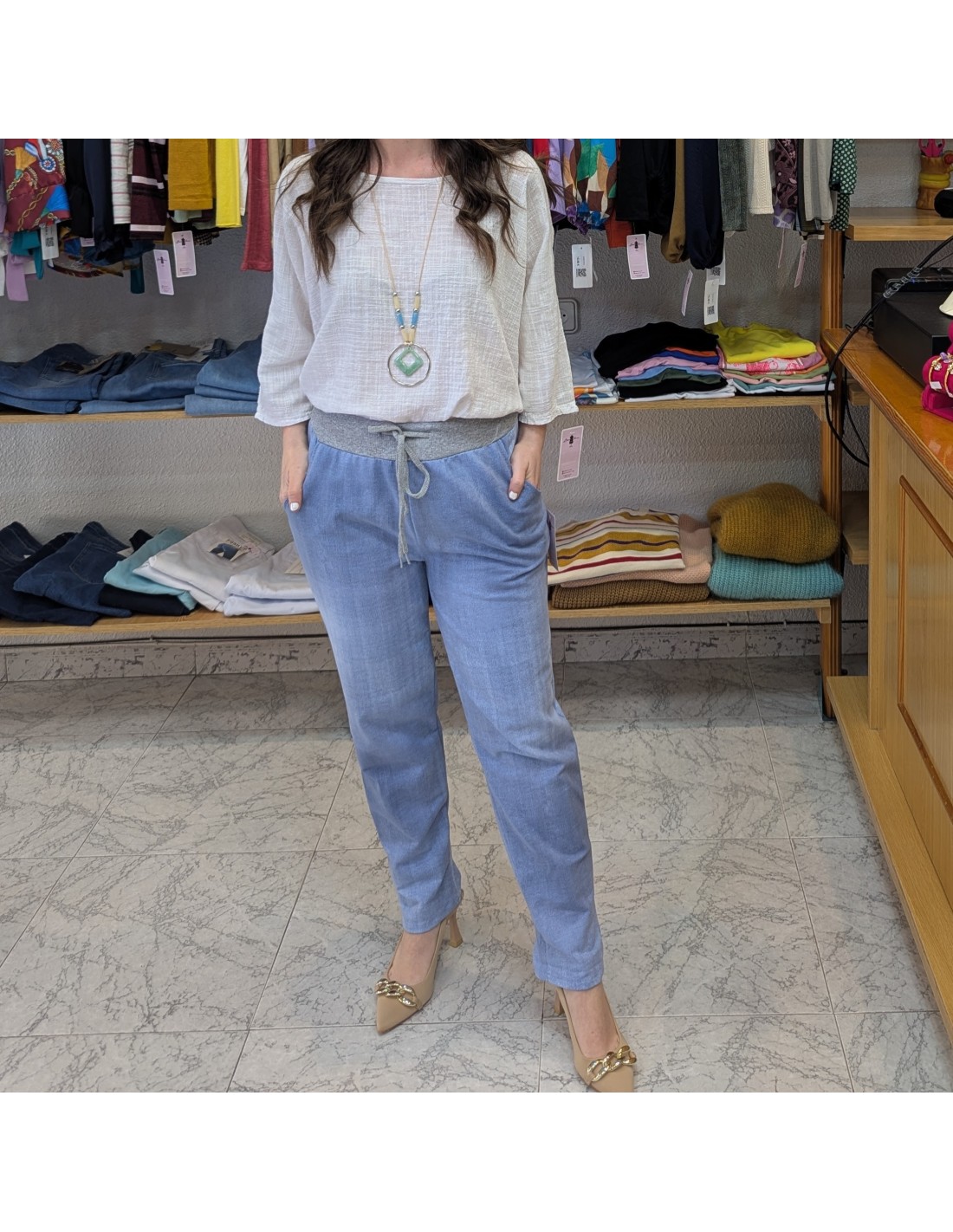 Pantalón de algodón tipo jogger de estilo casual en azul vaquero, cinturilla elástica y ajustable con cordón y tiene bolsillos. Cómodo y fresco perfecto para primavera y verano.