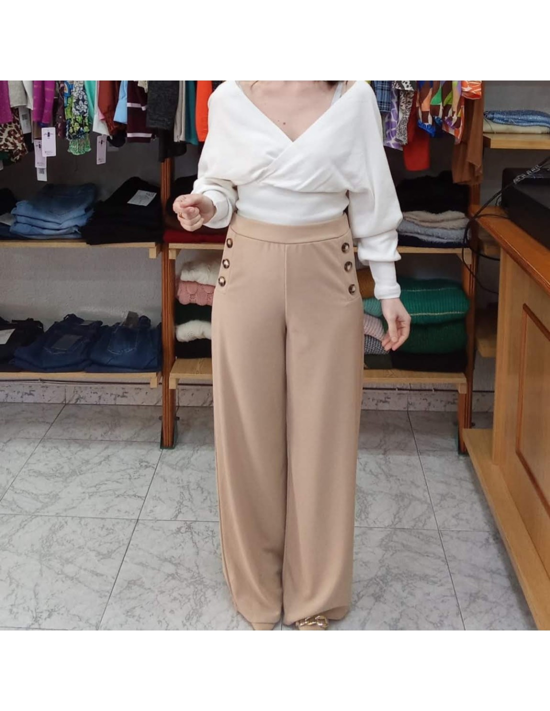 Pantalón de vestir de talle medio-alto elegante y cómodo, con un diseño impecable. De cintura elástica se adapta perfectamente al cuerpo estilizando la silueta con total confort. De corte entallado en la cadera y se abre en una pierna ancha que aporta elegancia y movimiento, creando una silueta estilizada. Los falsos bolsillos con detalles de botones añaden un toque sofisticado. Está confeccionado en un tejido ligero y fluido con excelente caída, es un imprescindible para un look impecable.