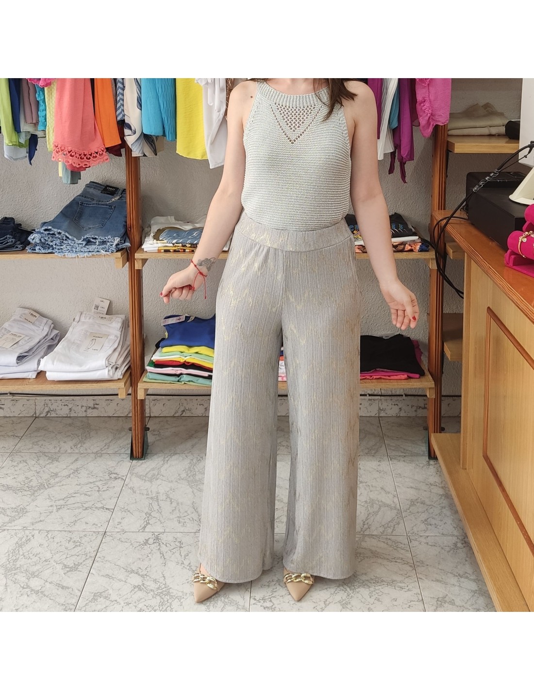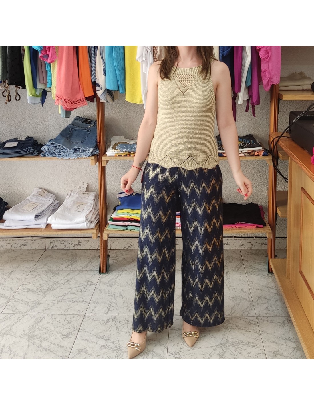 Pantalón de corte recto y pata ancha y suelta, talle medio/alto con goma en la cintura, estampado de zig-zag. Tejido con brillo, ligero y suave y no se arruga.