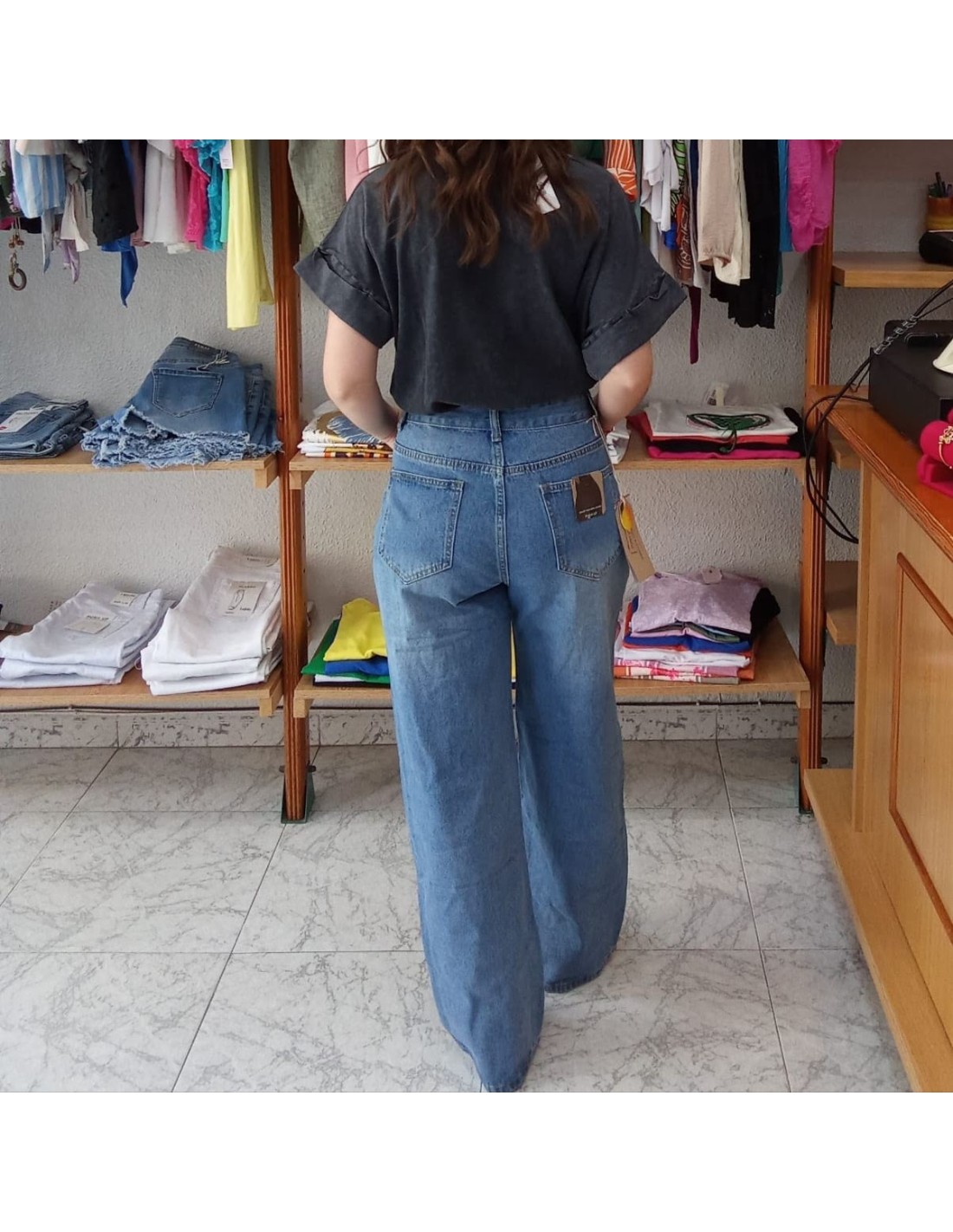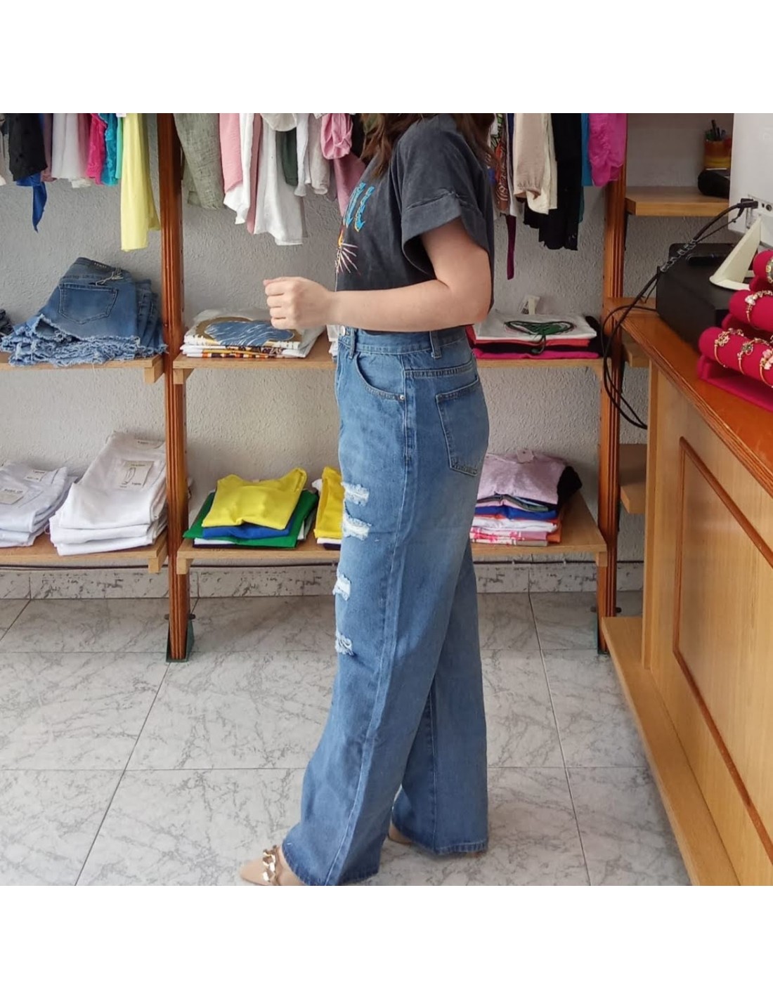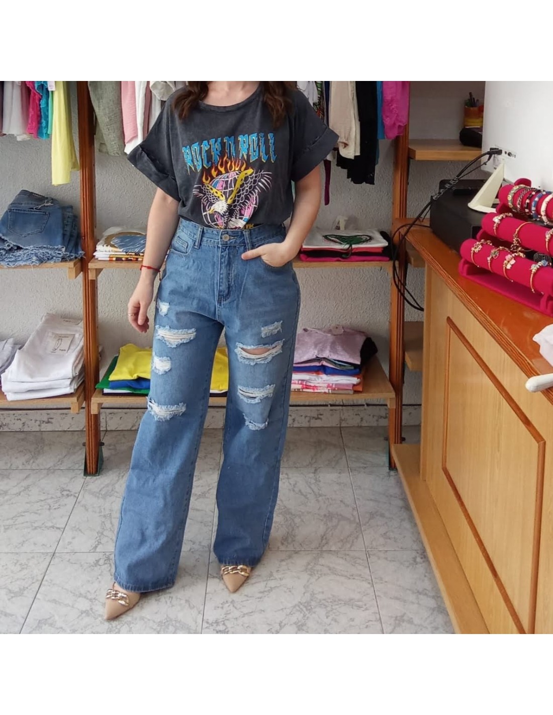 Pantalón vaquero de estilo Mom Jeans en azul claro. Tiene el talle alto y es de pata ancha, un vaquero muy cómodo que lleva rotos y le da un toque muy desenfadado y juvenil.