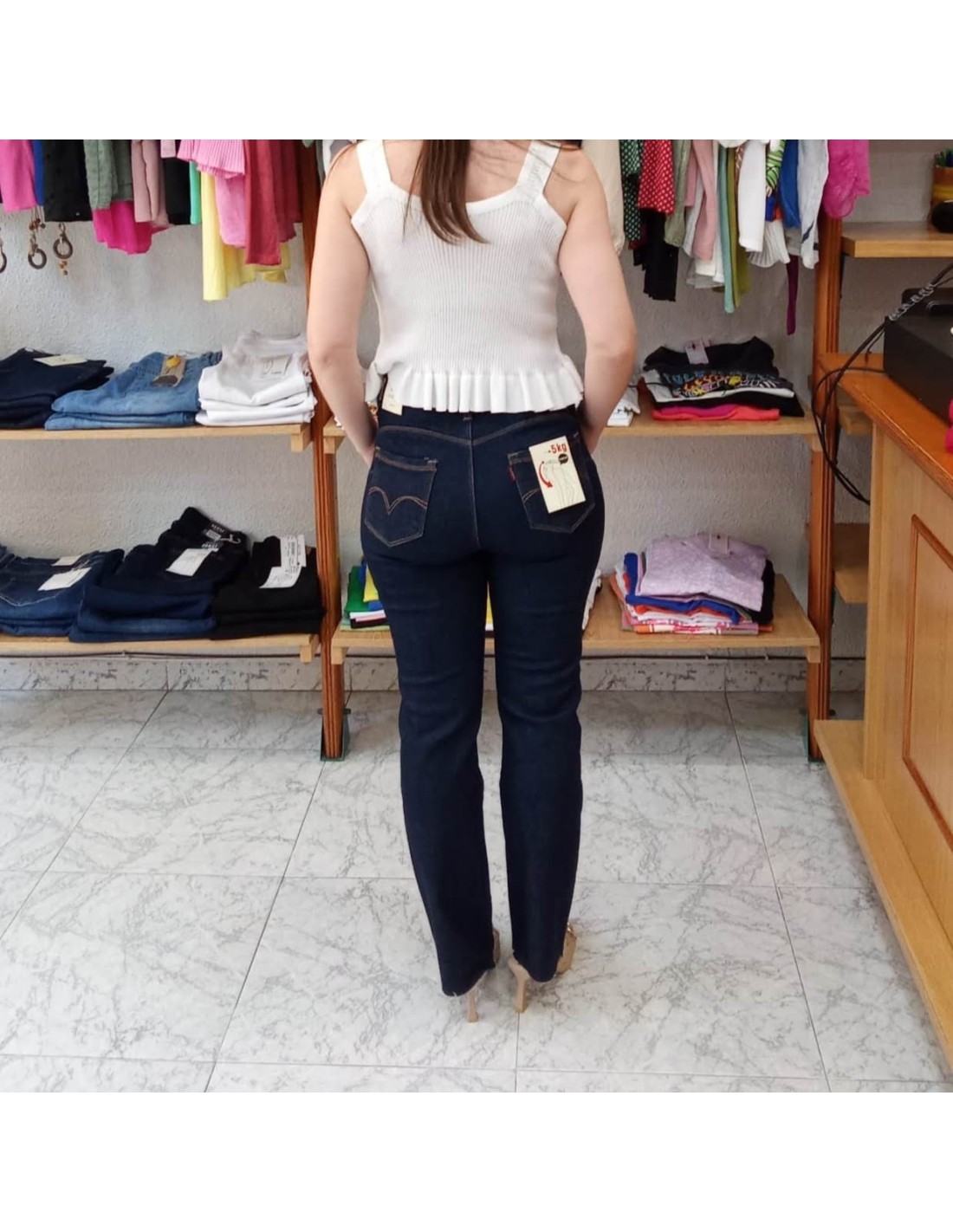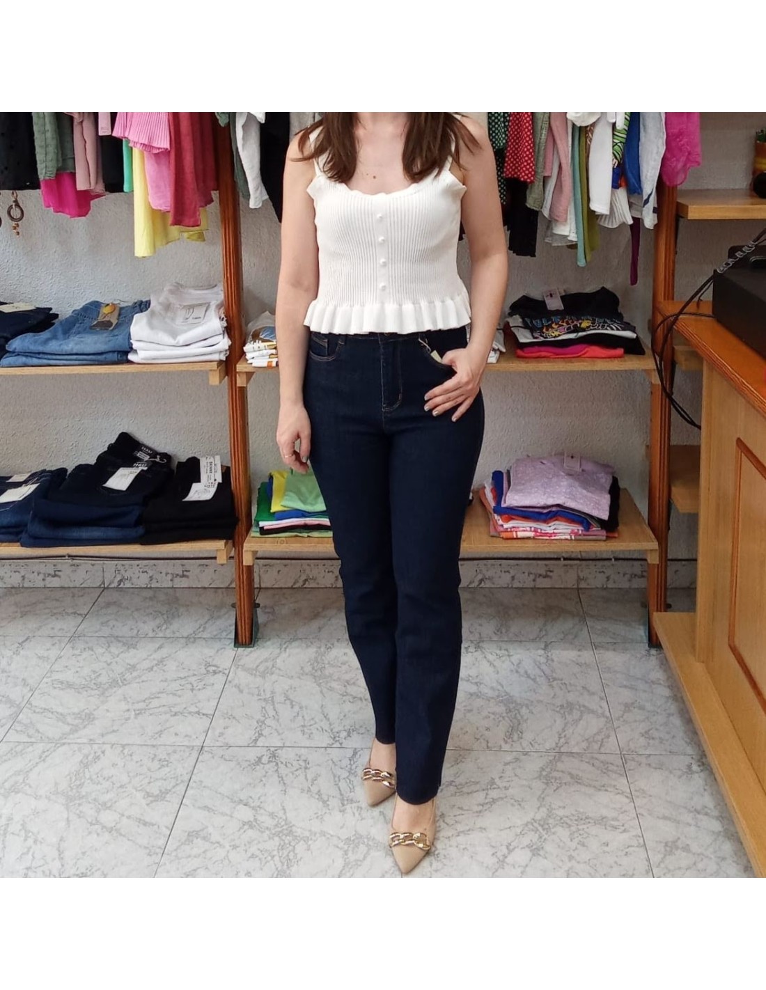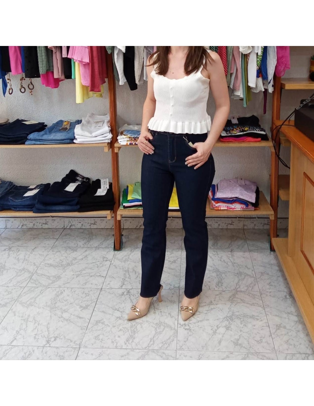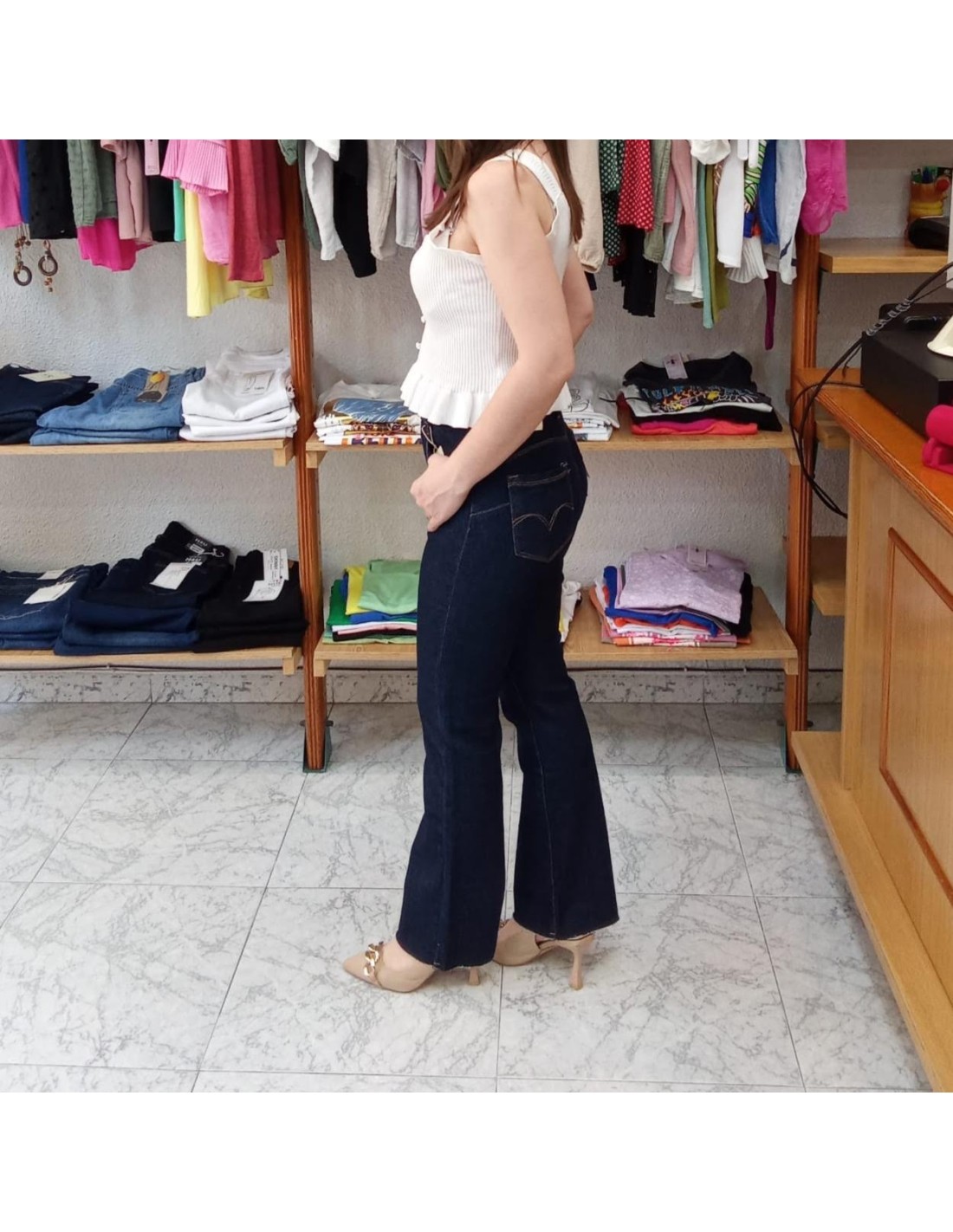 Vaquero en azul oscuro, con un corte ligeramente acampanado y un bajo deshilachado. Es un Vaquero de diseño clásico de 5 bolsillos y cierre de botón y cremallera. Un vaquero de estilo casual.