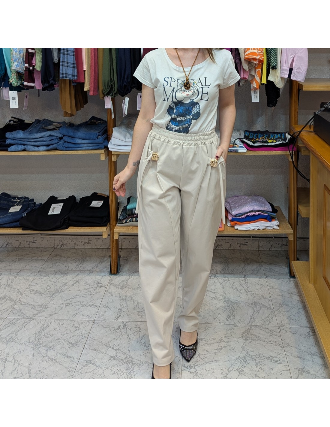 Pantalón de vestir, de algodón muy suave y cómodo, cintura elástica, tiene pinzas en la parte delantera que estilizan y crean una caída bonita en la pierna, es de talle medio/alto y tiene el corte holgado y ancho e incluye detalle de lazo con adorno de broche en dorado.