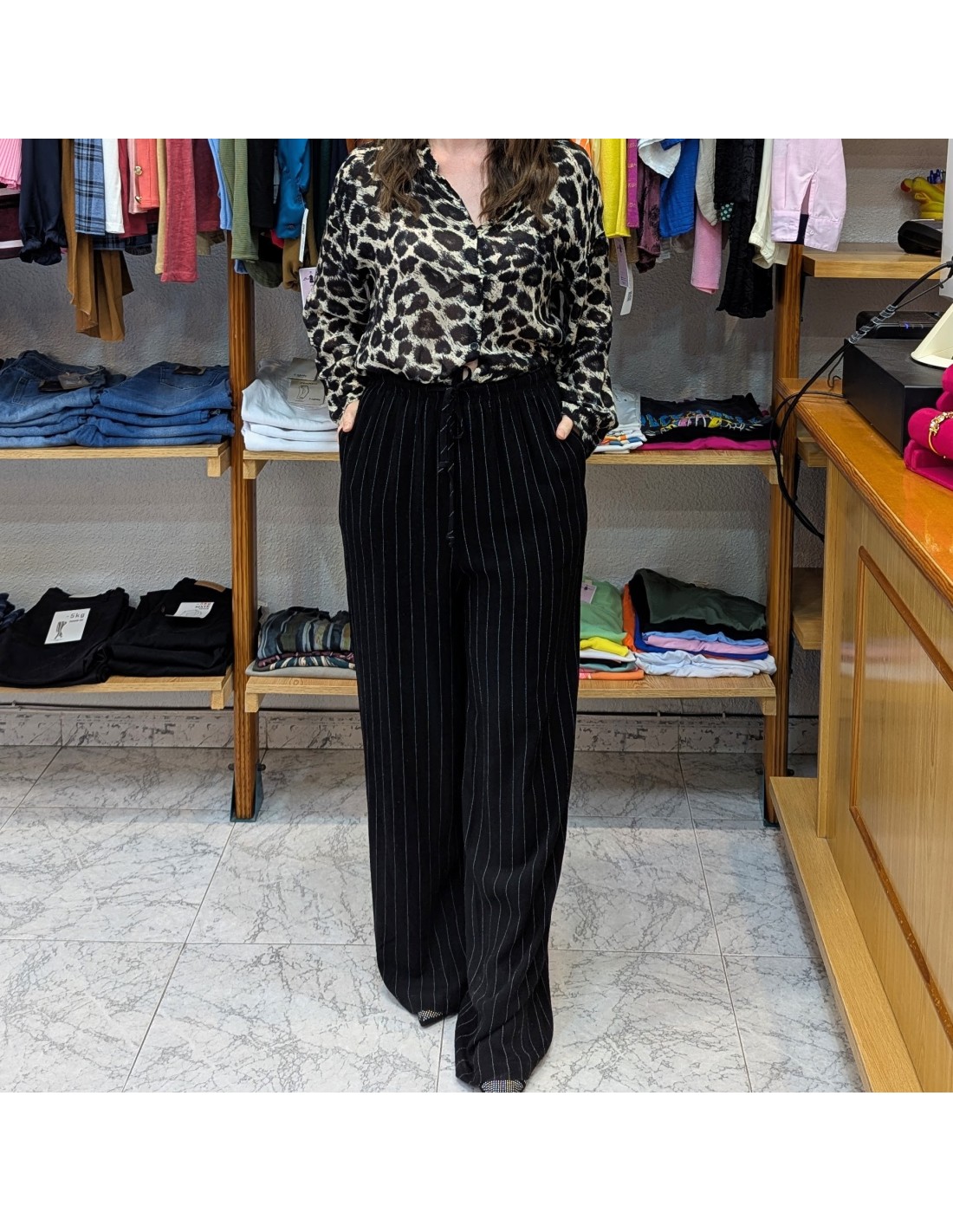 Pantalón de tejido de rayón, en color negro y con estampado de raya diplomática, talle alto con cintura elástica y ajustable con cordón, bolsillos completamente funcionales y pierna ancha.