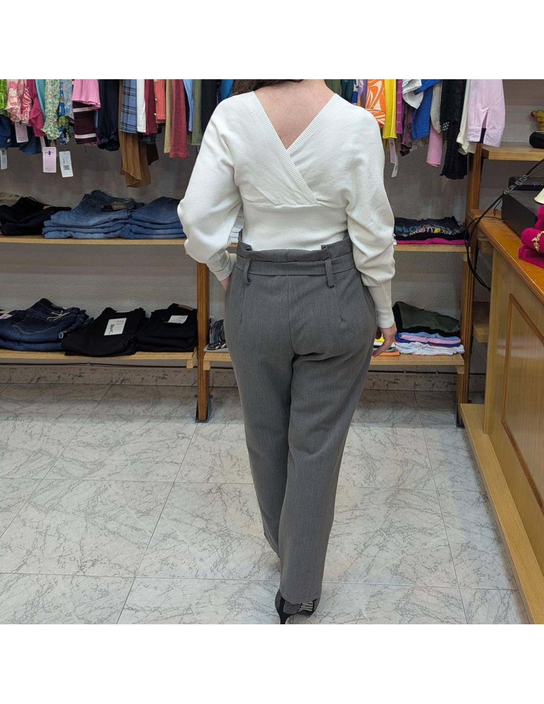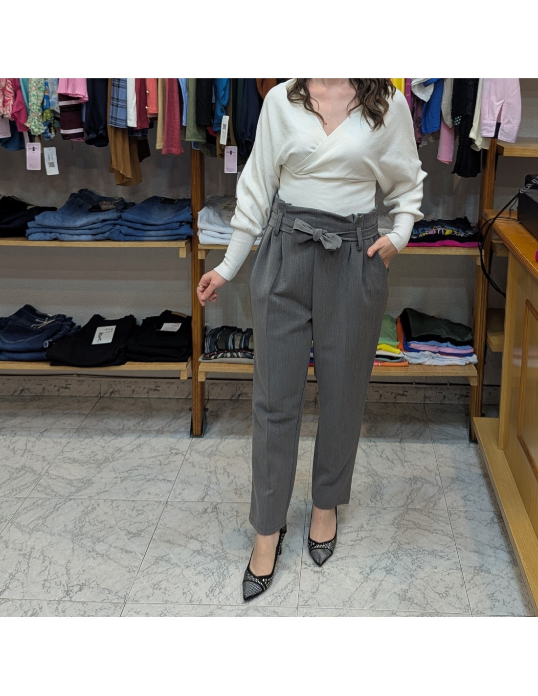 Pantalón de cintura alta con detalle de lazo en la cintura de corte tipo sastre con pinzas en la parte frontal y pata recta, bolsillos en los laterales completamente funcionales y tiene cremallera lateral. De tejido suave y cómodo.