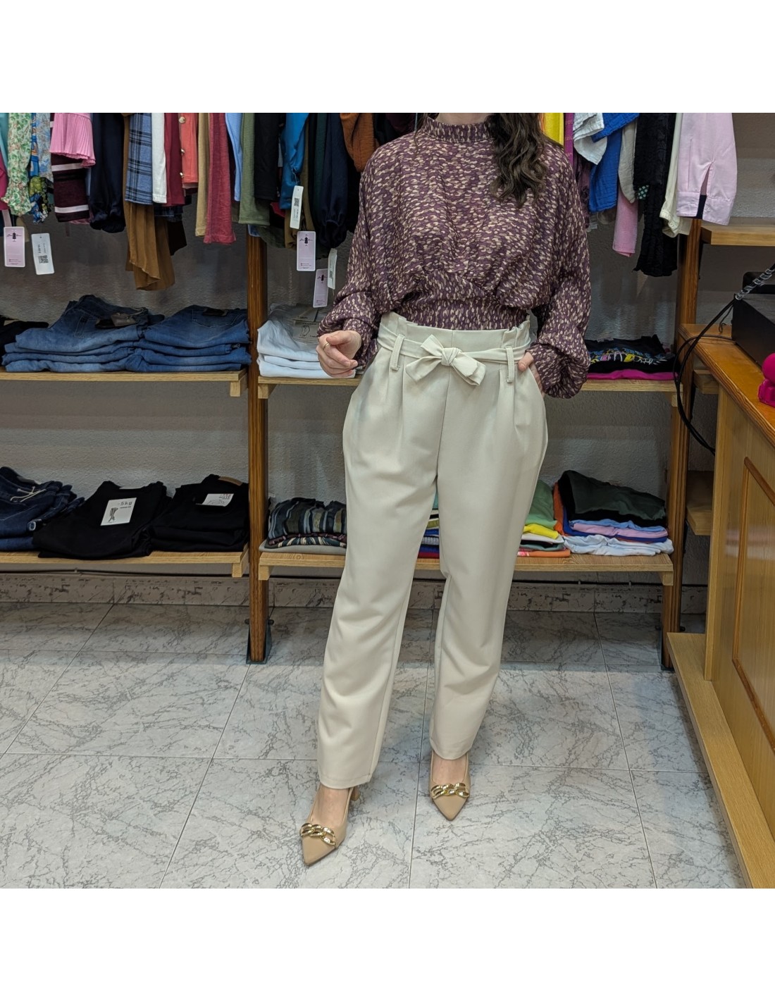 Pantalón de cintura alta con detalle de lazo en la cintura de corte tipo sastre con pinzas en la parte frontal y pata recta, bolsillos en los laterales completamente funcionales y tiene cremallera lateral. De tejido suave y cómodo.