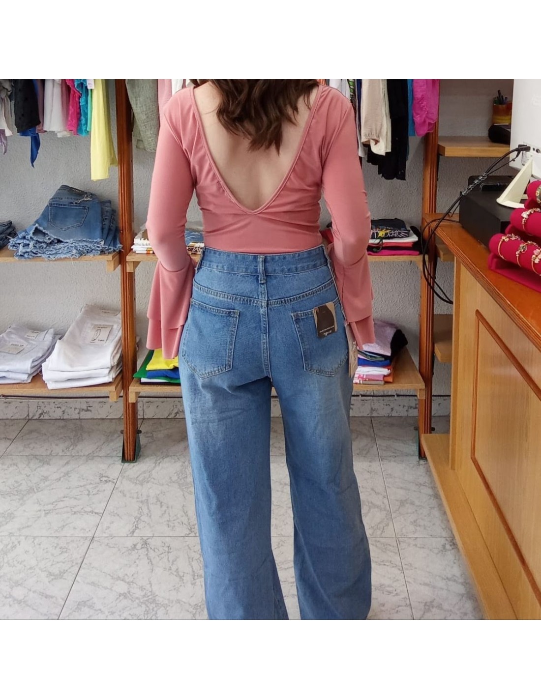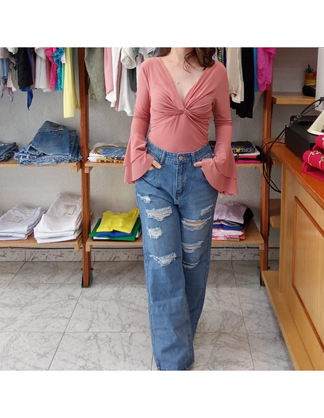 De tejido licra es elástico, tiene escote y espalda en V, en la parte del pecho tiene efecto de nudo, le da el toque decorativo y ajustado en esta zona. Manga larga con acabado en forma acampanada que lo hace muy elegante.