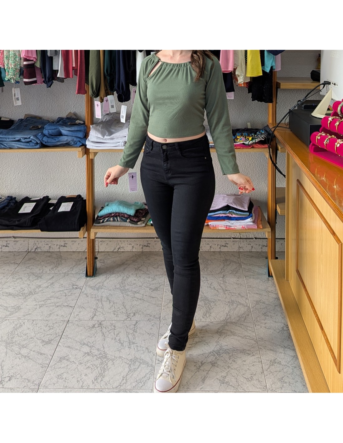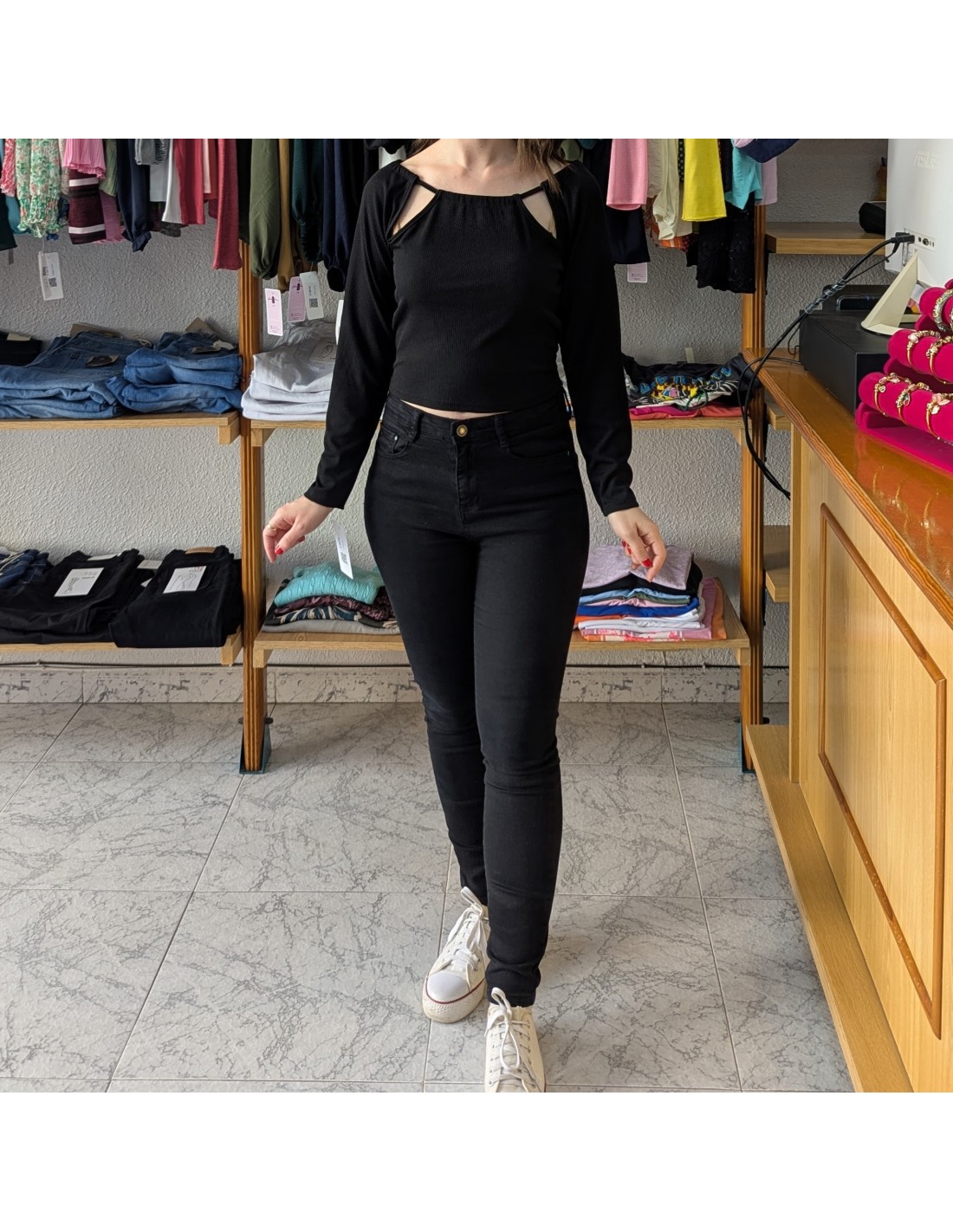 Top corto, de manga larga, de tejido acanalado. Presenta aberturas en los hombros y la espalda. Largo hasta la cintura.