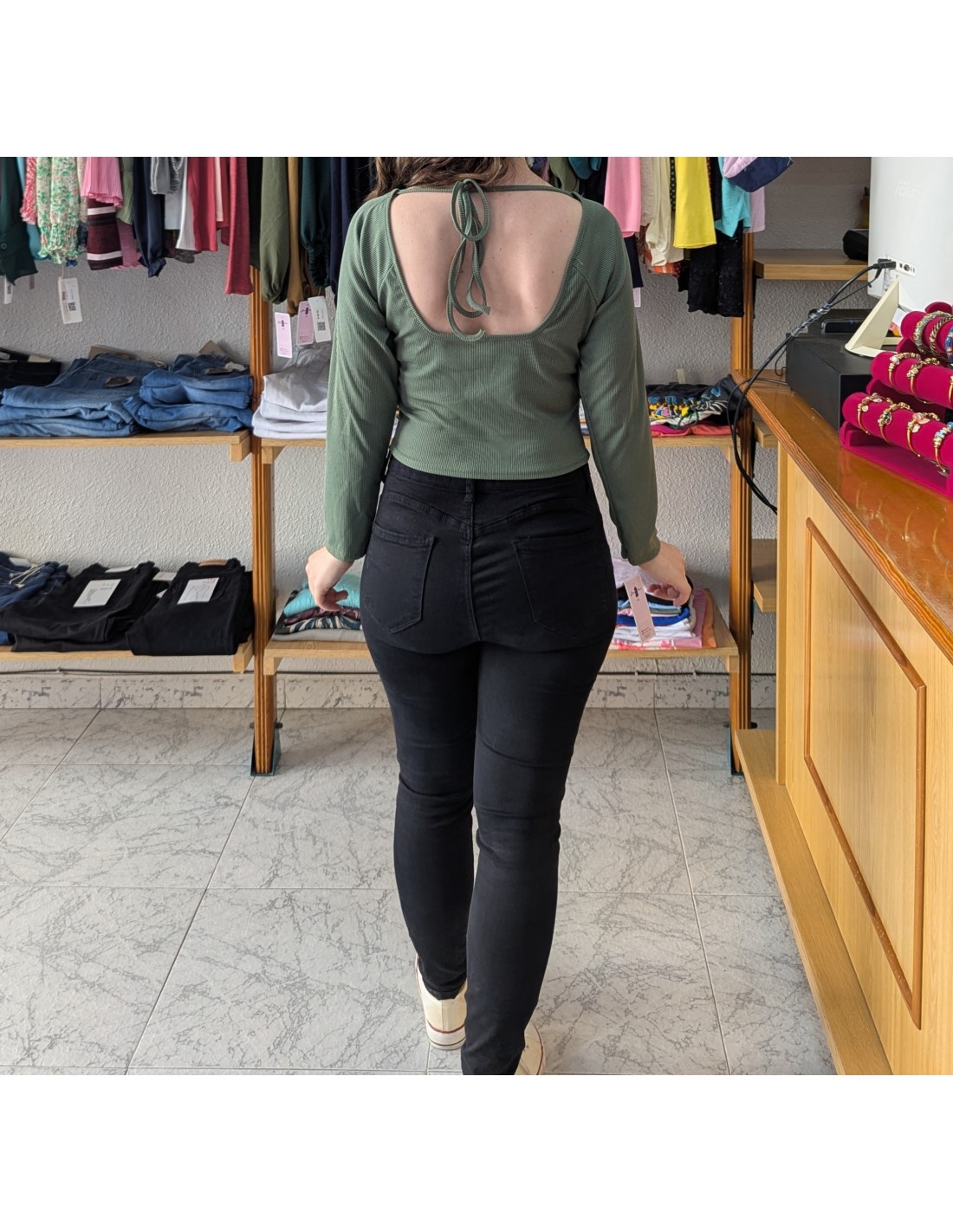 Top corto, de manga larga, de tejido acanalado. Presenta aberturas en los hombros y la espalda. Largo hasta la cintura.