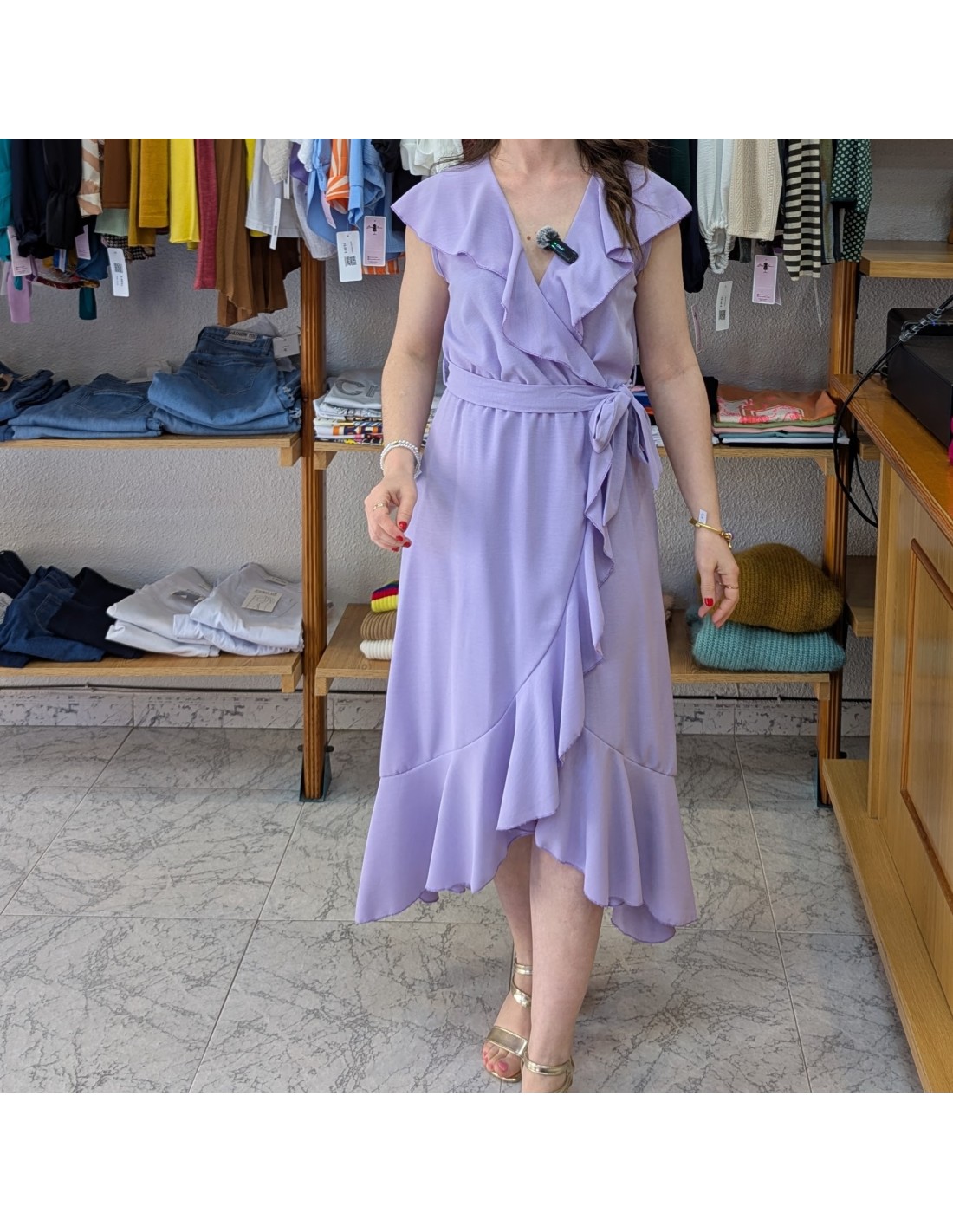 Vestido de diseño romántico, con efecto cruzado, detalle de volantes en cascada en el escote, tiene goma en la cintura, cinturón de lazo de la misma tela de la prenda y detalle de volante en la parte inferior para darle movimiento.