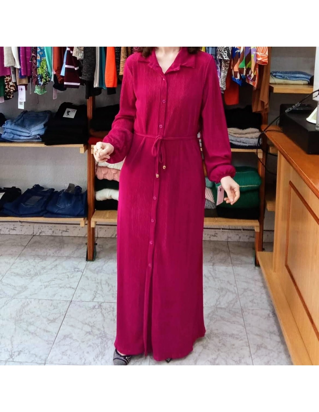 Vestido largo de corte camisero. De tejido de canalé fino con acabado satinado que le aporta un toque elegante, tiene botonadura a lo largo de toda la prenda y detalle de cinturón para ceñir la cintura. Perfecto para tus eventos primaverales.
