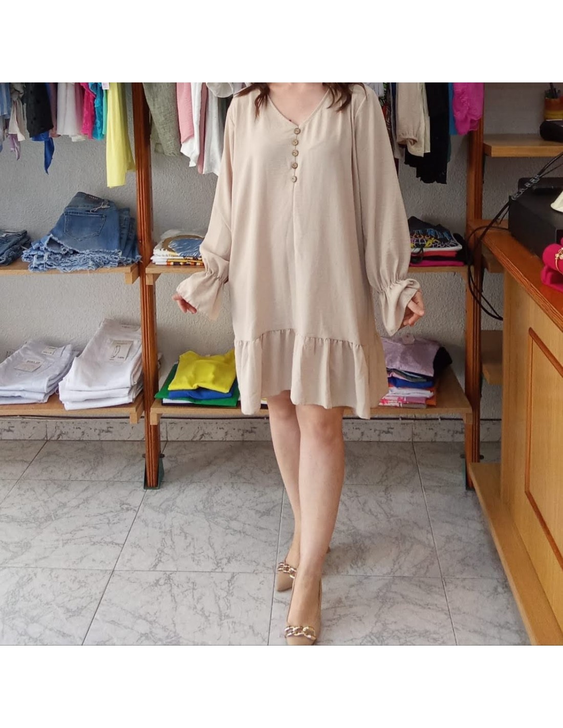 Vestido de manga larga y corte holgado en color crema. Tiene escote en pico con detalle de botones, manga larga con terminación en puño con volante, creando un efecto abullonado. En el bajo del vestido, tiene detalle de volante. Es un vestido con caída fluida y ligera.