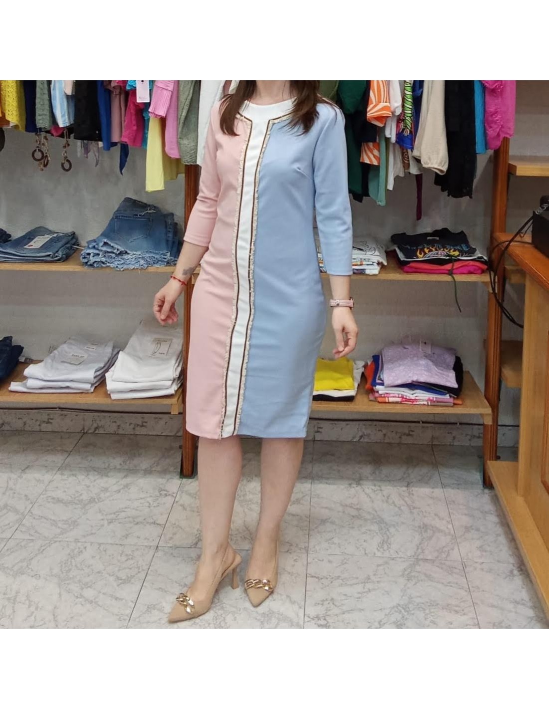 Vestido de corte recto y largo hasta la rodilla, tiene diseño bicolor en rosa y azul dividido en vertical. Cuello redondo en blanco adornado con un ribete negro y flecos en beige con detalles dorados que recorre la línea divisoria central del vestido. De manga francesa, es un vestido muy femenino y es ideal para eventos.
