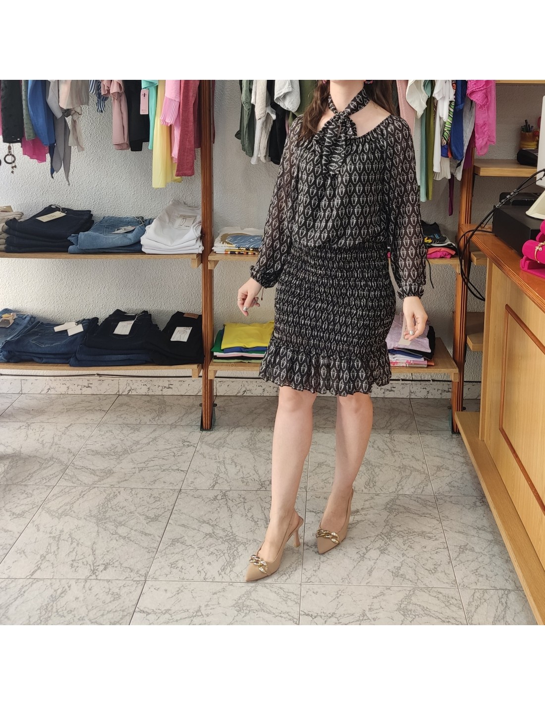 Vestido corto de gasa, escote redondo y manga larga abullonada en los hombros y ajustado en los puños. La parte superior es holgada, mientras que la falda es ajustada y fruncida con efecto nido de abeja y termina con un pequeño volante en el bajo. Estampado elegante en tonos claros.
