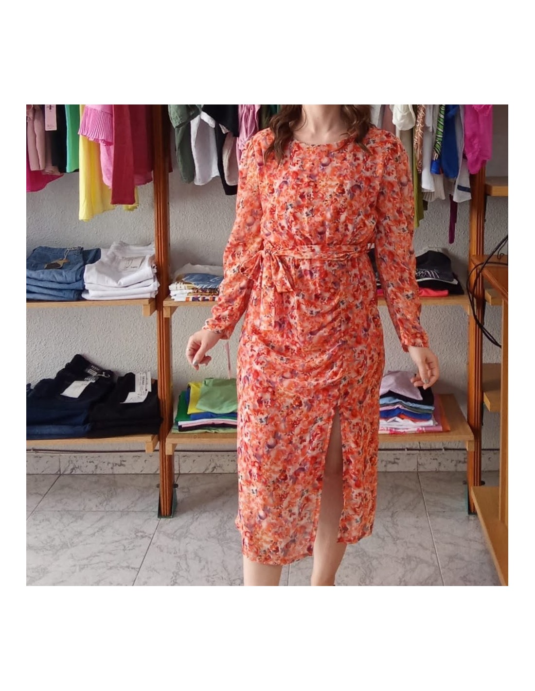 Vestido de gasa, largo midi con estampado floral en tonos cálidos, manga larga recta. Cintura elástica definida por un lazo del mismo tejido. Falda con abertura en un lateral y drapeado. Escote redondo y sencillo. Tiene forro en todo el vestido.
