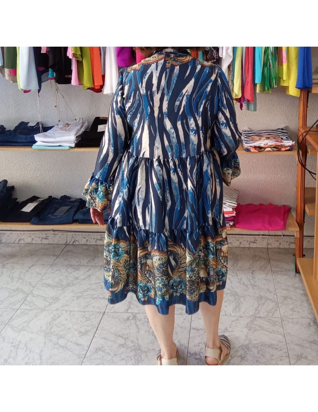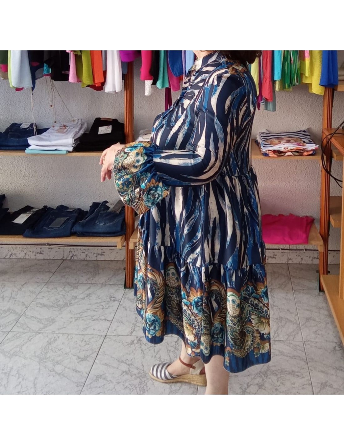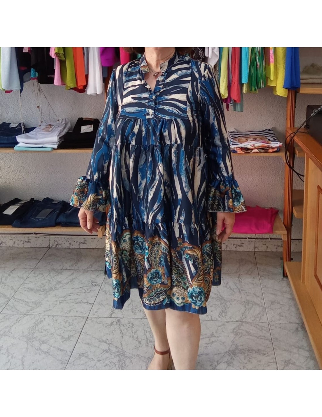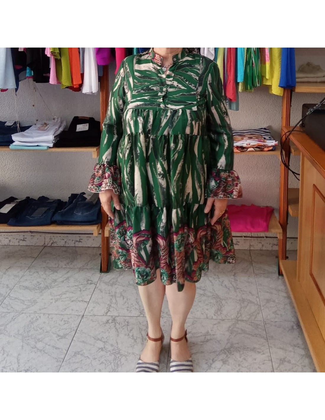 Vestido de manga larga con terminación de volantes, cuello mao con escote en V y botones en la zona del pecho. El corte es holgado y escalonado, un vestido con vuelo, y largo por debajo de la rodilla. Estampado floral y abstracto.