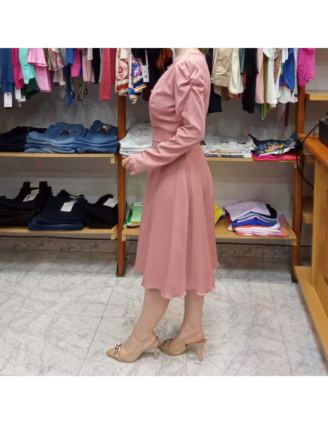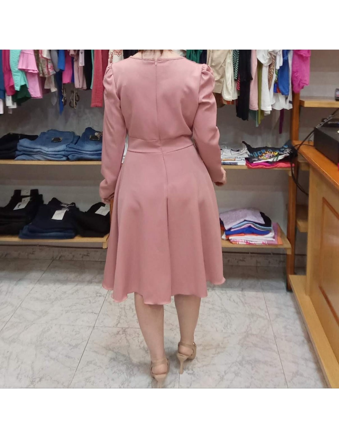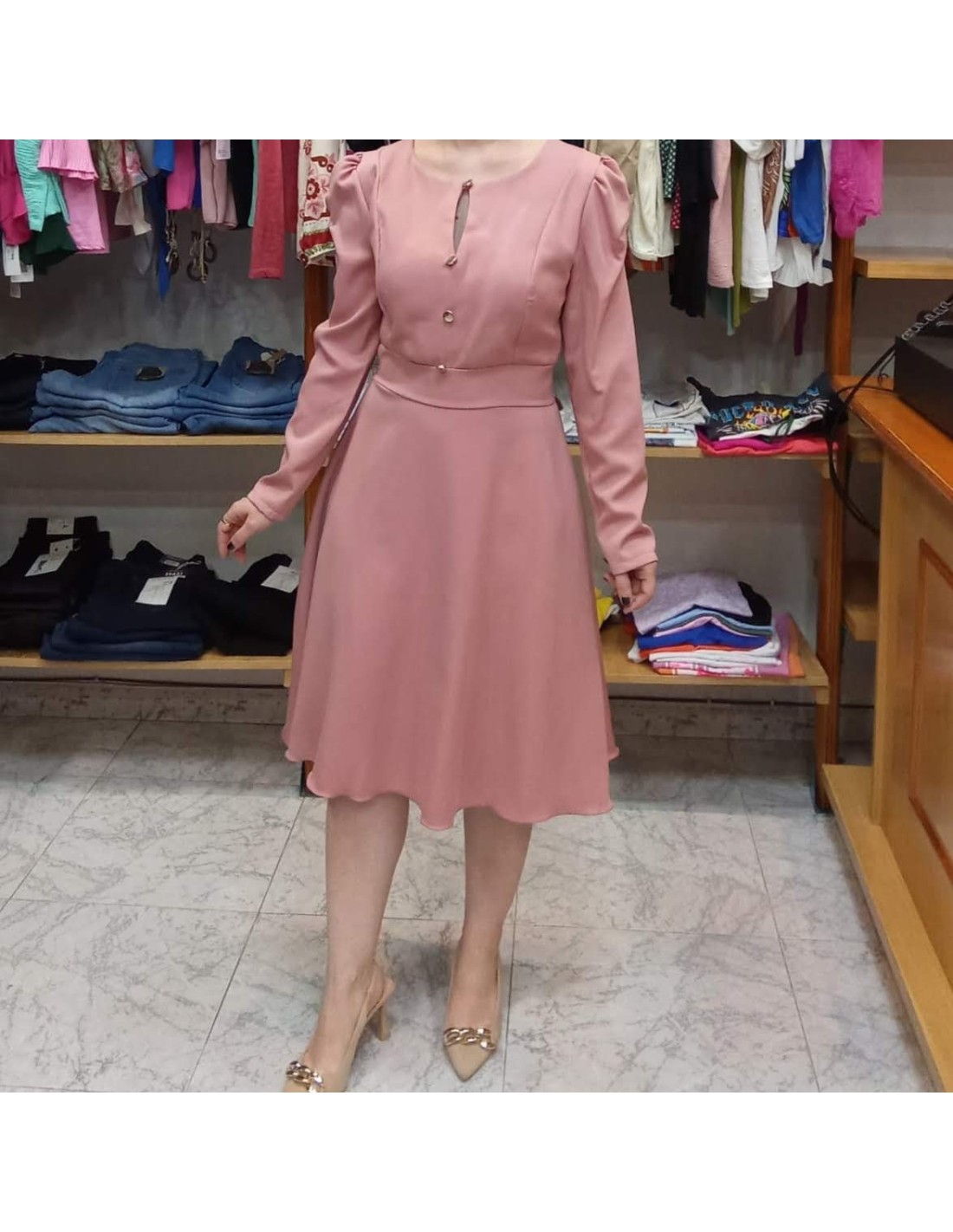 Vestido de diseño elegante, en color rosa palo, tiene corte con vuelo, que llega por debajo de la rodilla, tiene escote redondo con abertura en la zona del pecho con detalle de botones dorados y tiene cascos, cremallera en la espalda, manga larga recta y abullonada en la parte superior, a la altura de los hombros.