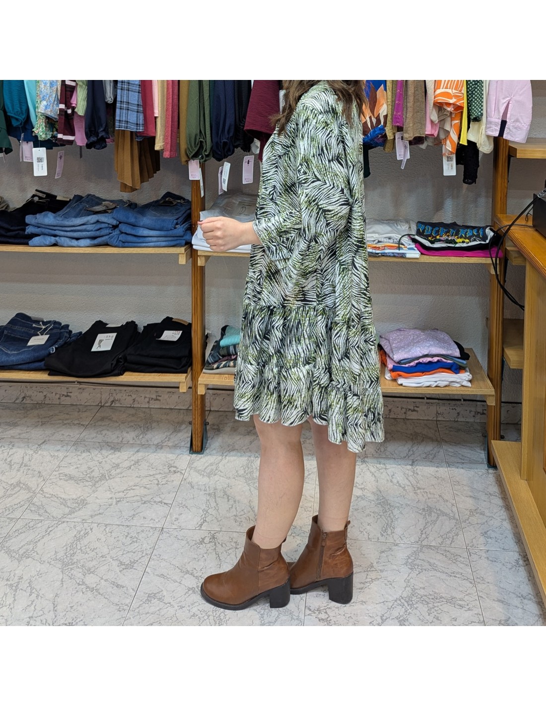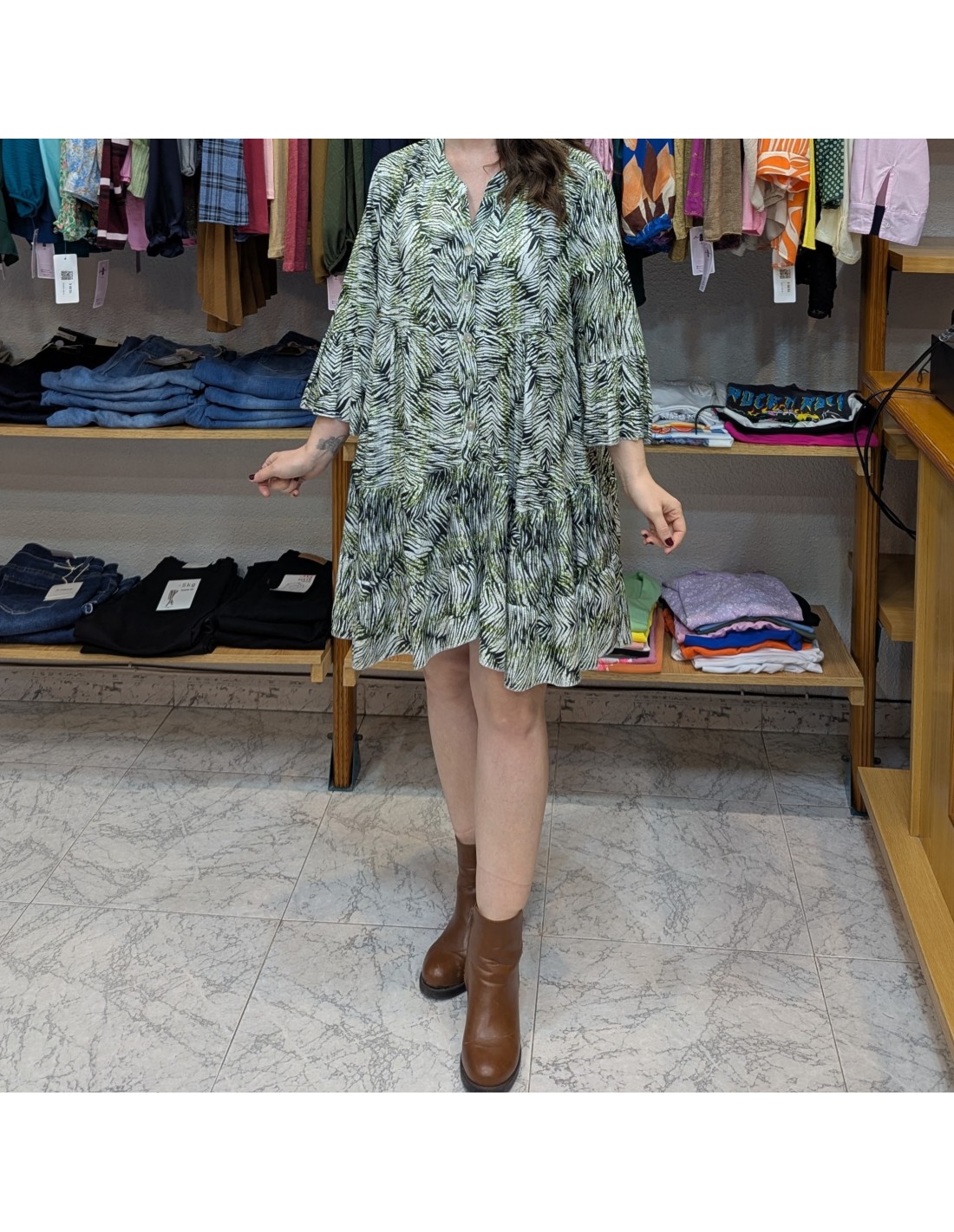 Vestido de manga 3/4 con estampado en colores combinados. Tiene cuello mao con escote en V y botones a lo largo de la prenda que son nacarados. Tiene 3 niveles con frunces que le dan volumen, creando un efecto escalonado.