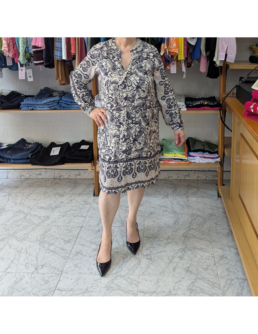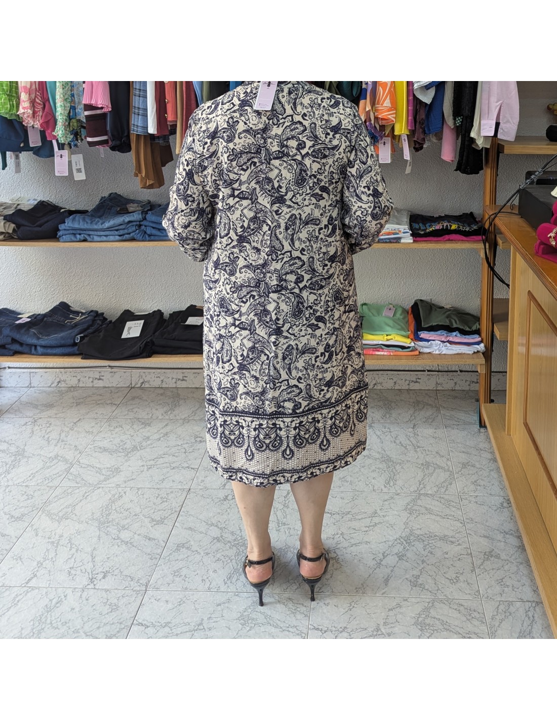 Vestido de corte camisero, muy casual y con corte holgado, tiene cuello mao y escote en V, de manga larga con opción a 3/4 y tiene estampado de cachemira en azul.