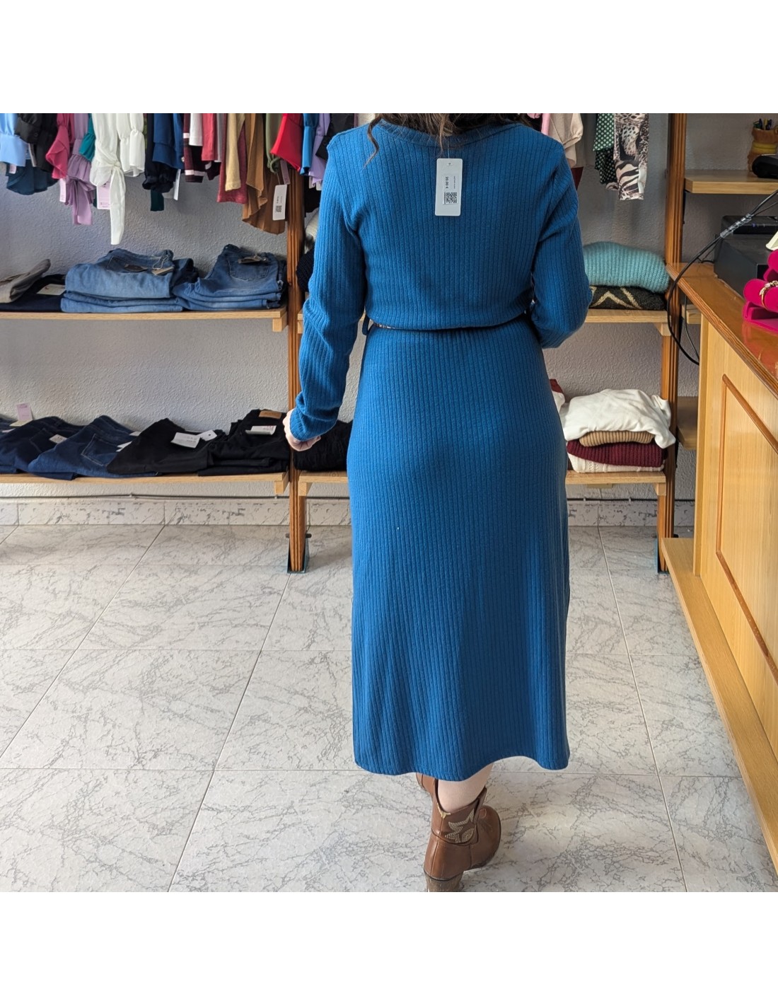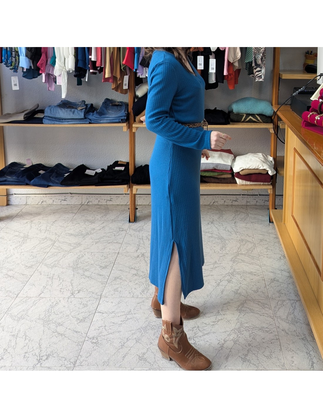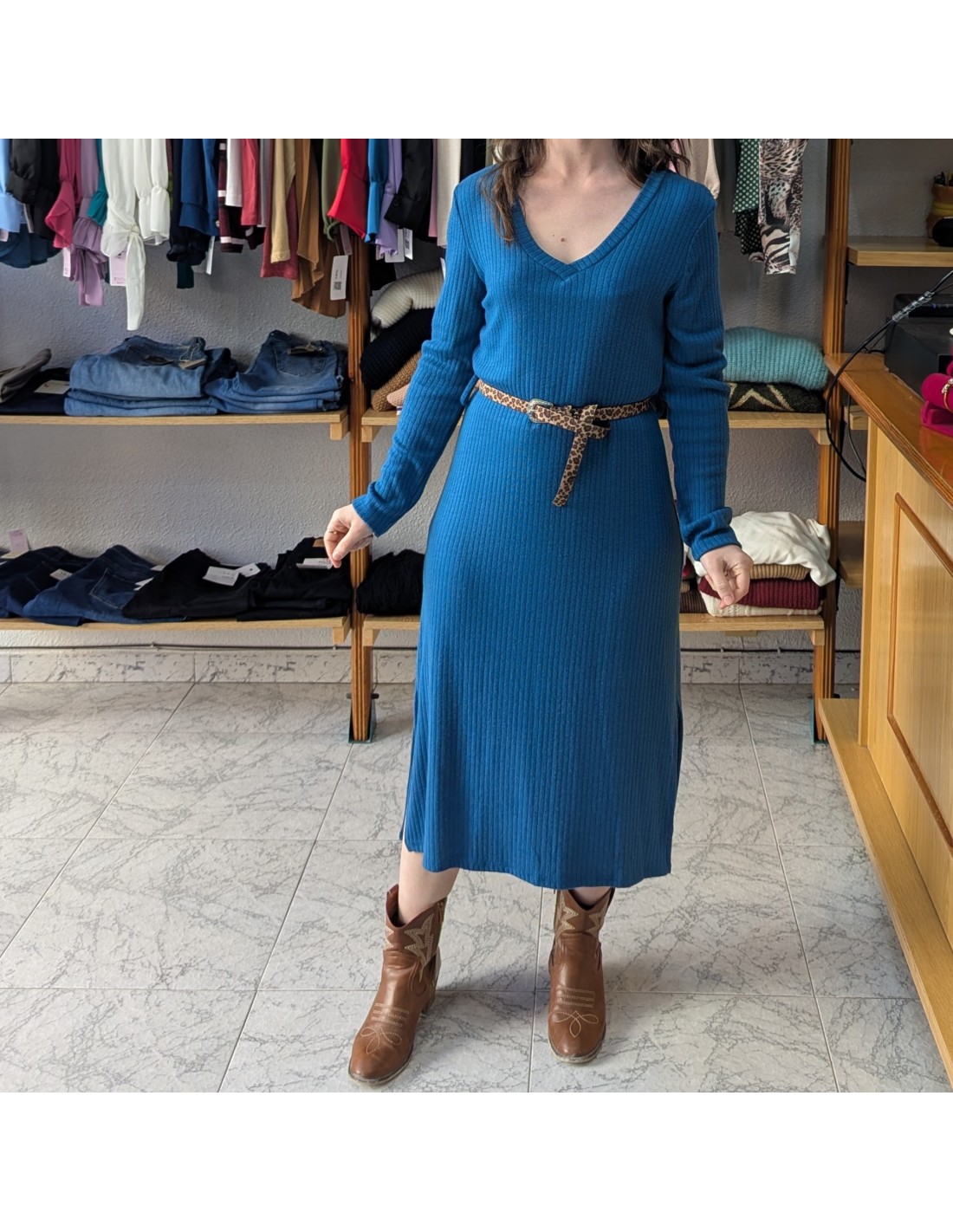 Vestido de largo midi de punto canalé en azul con escote en V y manga larga. Incluye un cinturón fino con estampado de leopardo.