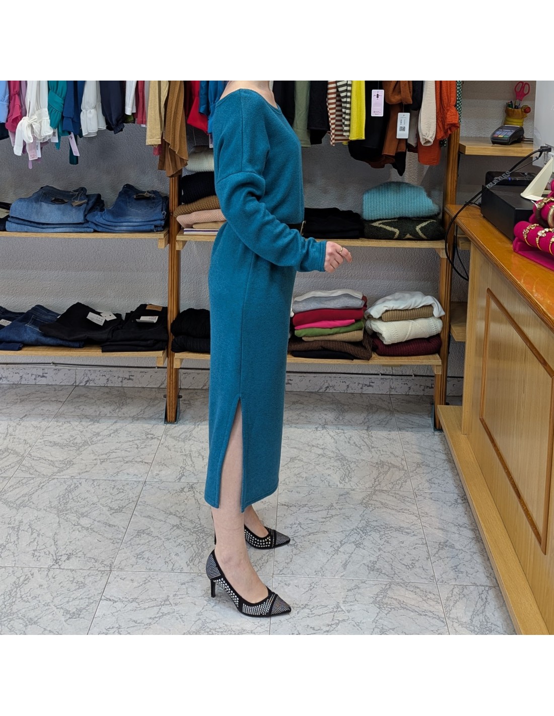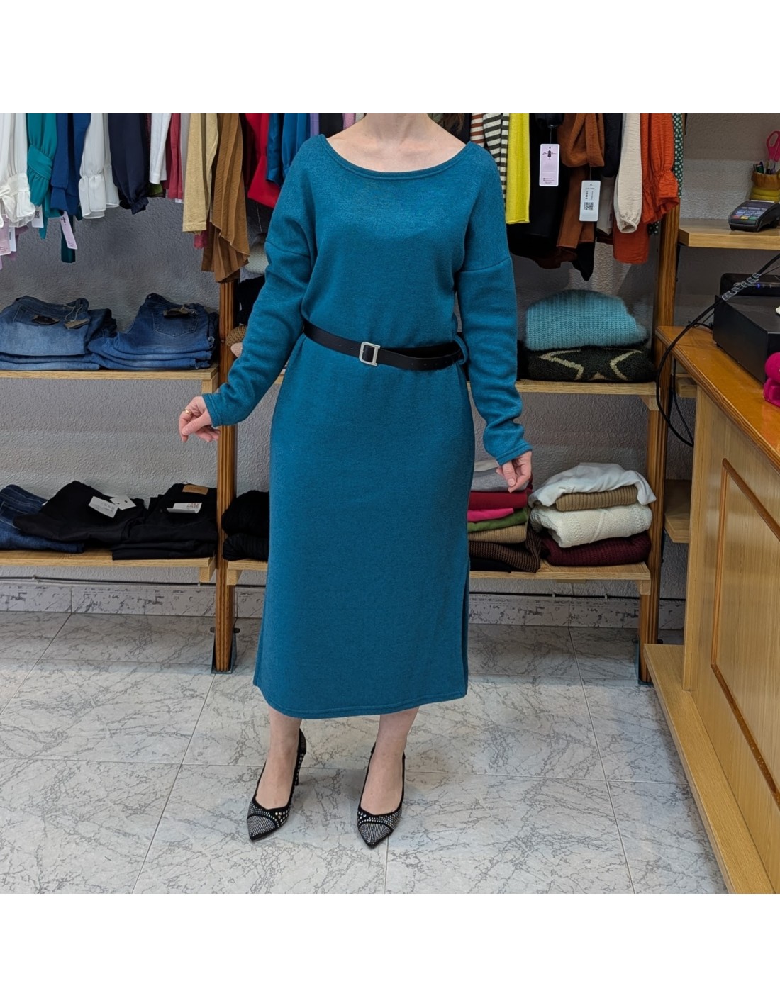 Vestido midi de punto en un tono azul verdoso, con manga larga y escote barco y tiene detalle de aberturas en la parte inferior, además se complementa con un cinturón.