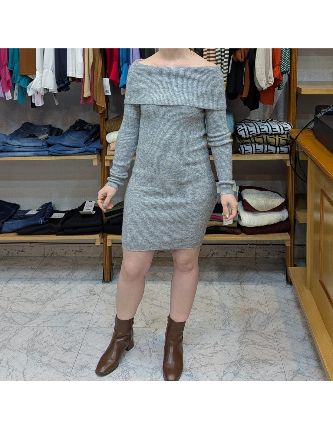 Vestido de lana en color gris, de tejido de canalé, cálido y elástico, se adapta a la figura, liso todo el cuerpo, escote bardot y largo midi.